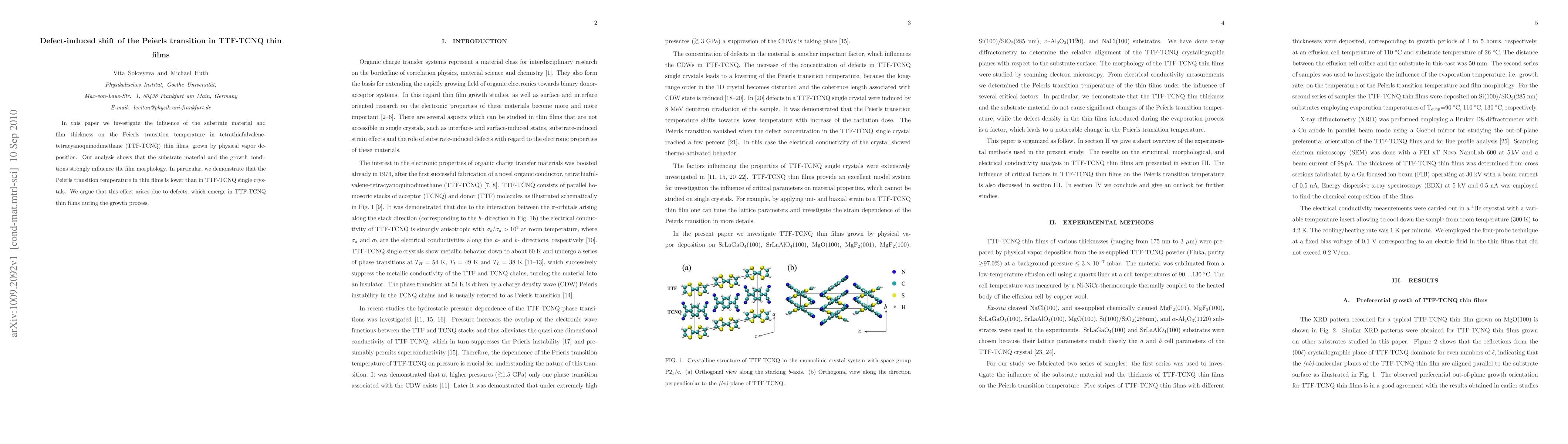 In this paper we investigate the influence of the substrate material and film thickness on the Peierls transition temperature in tetrathiafulvalene-tetracyanoquinodimethane (TTF-TCNQ) thin films, grown by physical vapor deposition. Our analysis shows that the substrate material and the growth conditions strongly influence the film morphology. In particular, we demonstrate that the Peierls transition temperature in thin films is lower than in TTF-TCNQ single crystals. We argue that this effect arises due to defects, which emerge in TTF-TCNQ thin films during the growth process.