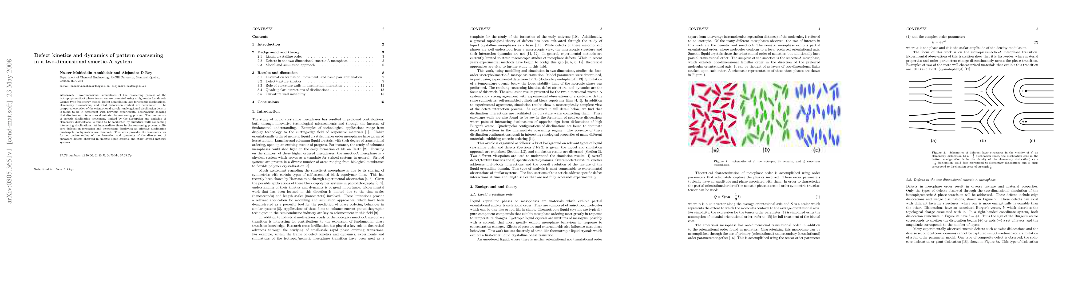 This study uses high-order Landau-de Gennes simulations to analyze the coarsening process in 2D smectic-A liquid crystals. It identifies defect annihilation laws and confirms that disclination interactions drive coarsening, with curvature walls facilitating disclination movement. The research also reveals split-core dislocation formation and quadrupole configurations at intermediate coarsening times, offering insights into defect dynamics in smectic liquid crystals and similar materials.