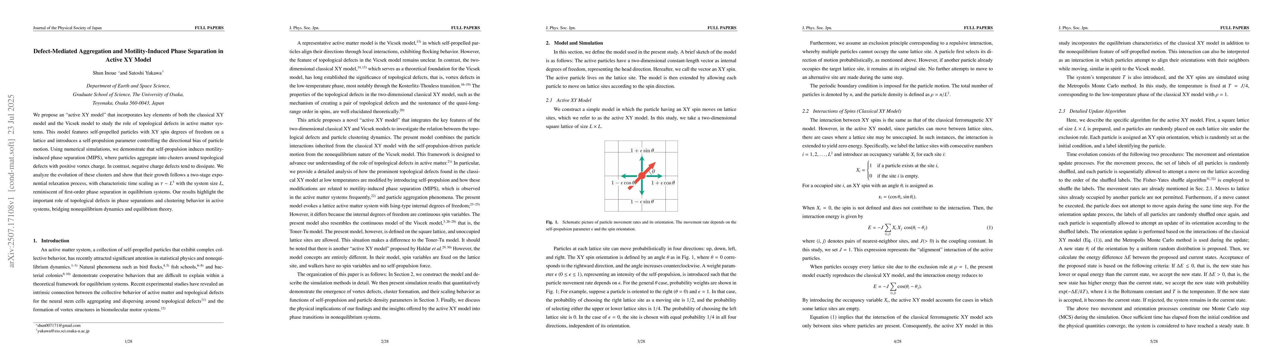 We propose an ``active XY model'' that incorporates key elements of both the classical XY model and the Vicsek model to study the role of topological defects in active matter systems. This model features self-propelled particles with XY spin degrees of freedom on a lattice and introduces a self-propulsion parameter controlling the directional bias of particle motion. Using numerical simulations, we demonstrate that self-propulsion induces motility-induced phase separation (MIPS), where particles aggregate into clusters around topological defects with positive vortex charge. In contrast, negative charge defects tend to dissipate. We analyze the evolution of these clusters and show that their growth follows a two-stage exponential relaxation process, with characteristic time scaling as $\tau \sim L^{3}$ with the system size $L$, reminiscent of first-order phase separation in equilibrium systems. Our results highlight the important role of topological defects in phase separations and clustering behavior in active systems, bridging nonequilibrium dynamics and equilibrium theory.
