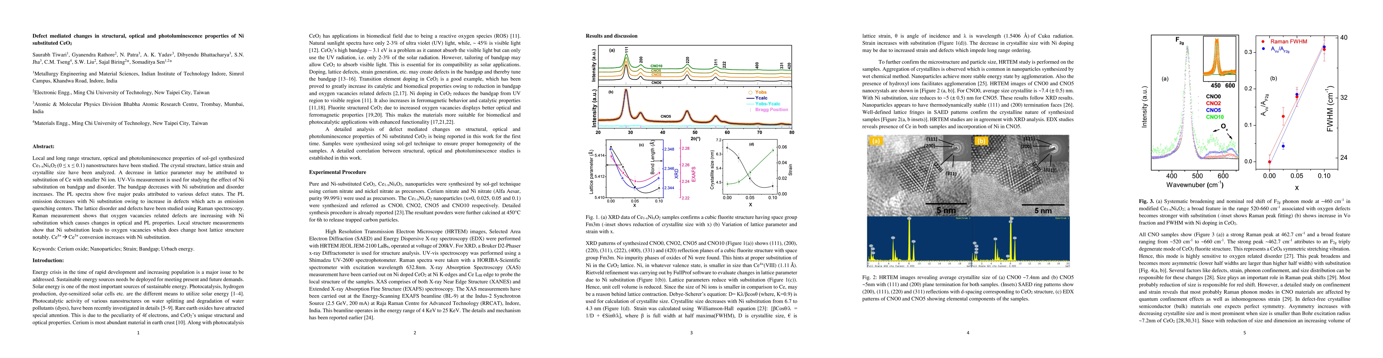 Local and long range structure, optical and photoluminescence properties of sol-gel synthesized Ce1-xNixO2 nanostructures have been studied. The crystal structure, lattice strain and crystallite size have been analyzed. A decrease in lattice parameter may be attributed to substitution of Ce with smaller Ni ion. UV-Vis measurement is used for studying the effect of Ni substitution on bandgap and disorder. The bandgap decreases with Ni substitution and disorder increases. The PL spectra show five major peaks attributed to various defect states. The PL emission decreases with Ni substitution owing to increase in defects which acts as emission quenching centers. The lattice disorder and defects have been studied using Raman spectroscopy. Raman measurement shows that oxygen vacancies related defects are increasing with Ni substitution which causes changes in optical and PL properties. Local structure measurements show that Ni substitution leads to oxygen vacancies which does change host lattice structure notably. Ce4+ to Ce3+ conversion increases with Ni substitution.