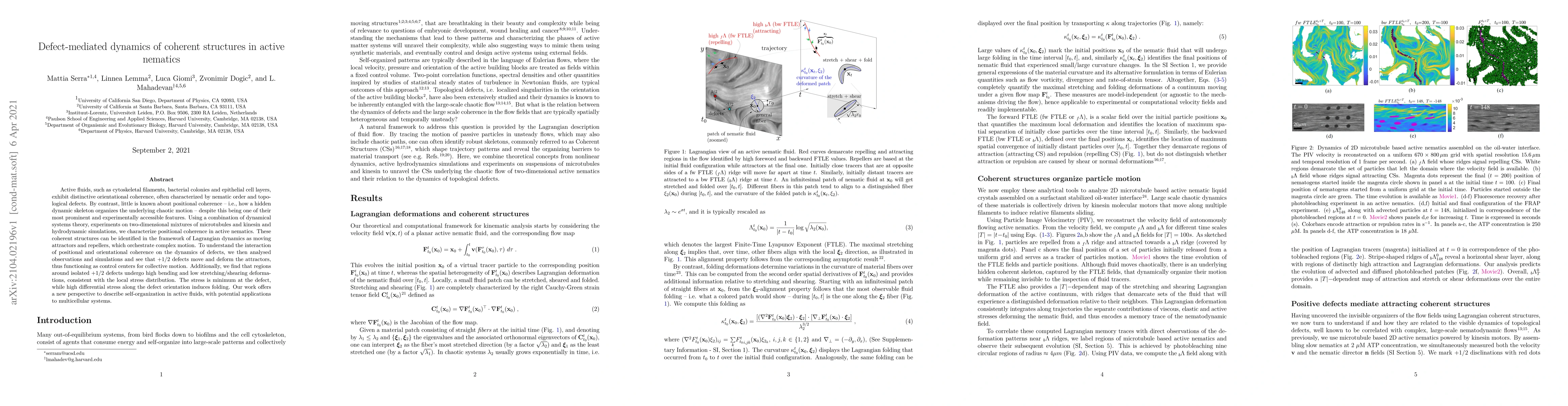 Active fluids, such as cytoskeletal filaments, bacterial colonies and epithelial cell layers, exhibit distinctive orientational coherence, often characterized by nematic order and topological defects. By contrast, little is known about positional coherence -- i.e., how a hidden dynamic skeleton organizes the underlying chaotic motion -- despite this being one of their most prominent and experimentally accessible features. Using a combination of dynamical systems theory, experiments on two-dimensional mixtures of microtubules and kinesin and hydrodynamic simulations, we characterize positional coherence in active nematics. These coherent structures can be identified in the framework of Lagrangian dynamics as moving attractors and repellers, which orchestrate complex motion. To understand the interaction of positional and orientational coherence on the dynamics of defects, we then analysed observations and simulations and see that +1/2 defects move and deform the attractors, thus functioning as control centers for collective motion. Additionally, we find that regions around isolated +1/2 defects undergo high bending and low stretching/shearing deformations, consistent with the local stress distribution. The stress is minimum at the defect, while high differential stress along the defect orientation induces folding. Our work offers a new perspective to describe self-organization in active fluids, with potential applications to multicellular systems.