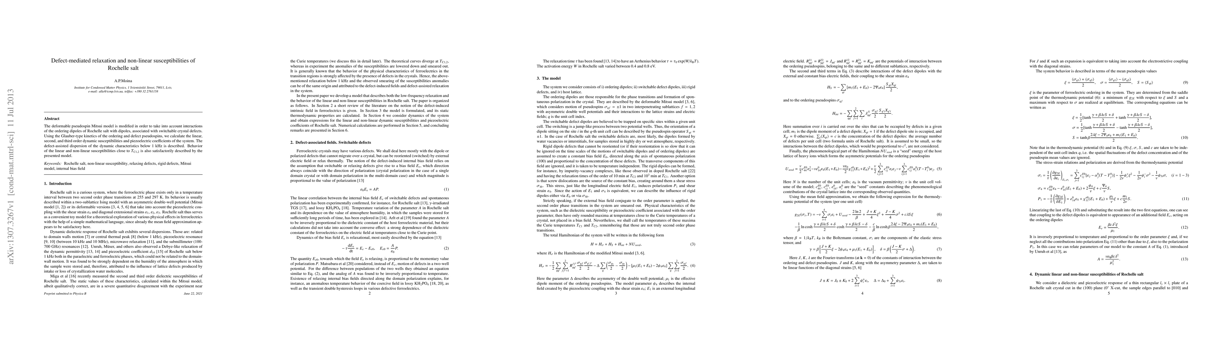 This paper modifies the deformable pseudospin Mitsui model to account for interactions between Rochelle salt's ordering dipoles and switchable crystal defects, calculating linear and non-linear dynamic susceptibilities and piezoelectric coefficients. The study describes defect-assisted dispersion and behavior near critical temperatures.