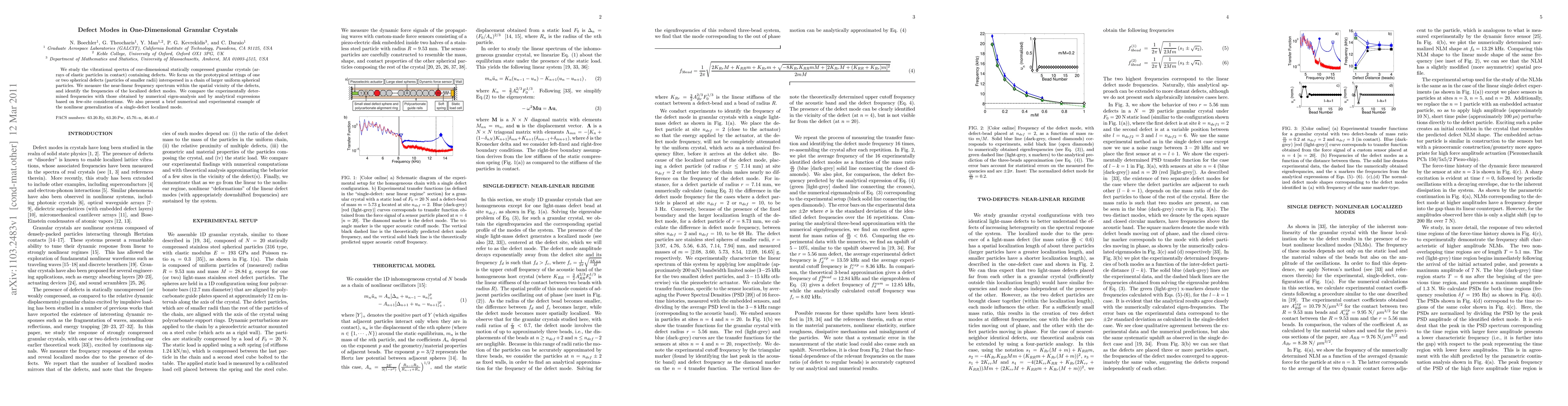 This paper investigates the vibrational spectra of one-dimensional granular crystals with defects, identifying localized defect modes and comparing experimental results with numerical and analytical models. It also explores the nonlinear behavior of a single-defect localized mode through both numerical simulations and experiments.