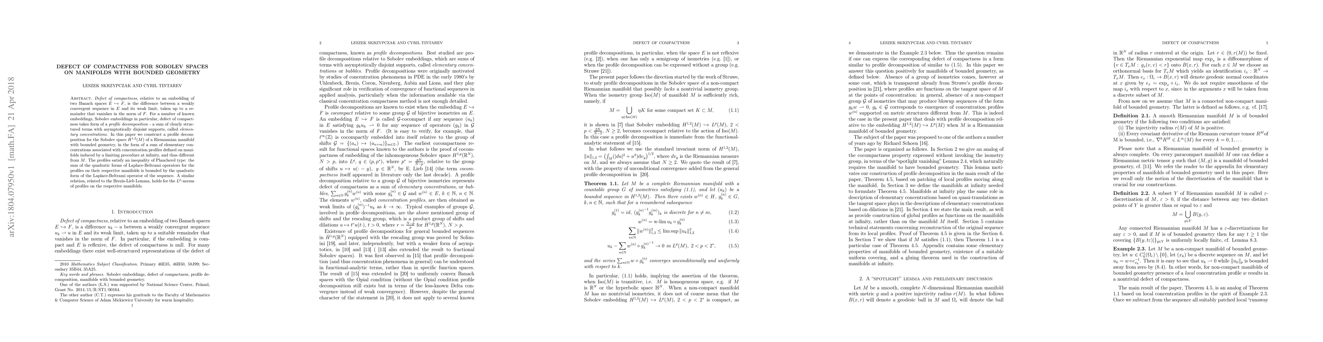 Defect of compactness, relative to an embedding of two Banach spaces E and F, is a difference between a weakly convergent sequence in E and its weak limit taken up to a remainder that vanishes in the norm of F. For Sobolev embeddings in particular, defect of compactness is expressed as a profile decomposition - a sum of terms, called elementary concentrations, with asymptotically disjoint supports. We discuss a profile decomposition for the Sobolev space of a Riemannian manifold with bounded geometry, which is a sum of elementary concentrations associated with concentration profiles defined on manifolds different from M, that are induced by a limiting procedure. The profiles satisfy an inequality of Plancherel type, and a similar relation, related to the Brezis-Lieb Lemma, holds for Lebesgue norms of profiles on the respective manifolds.