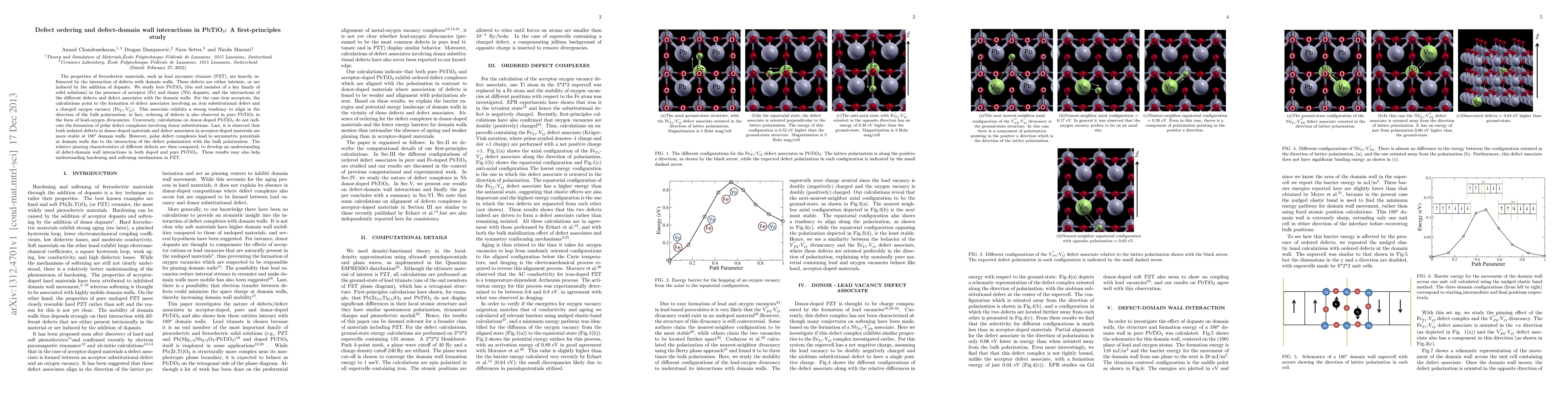 The properties of ferroelectric materials, such as lead zirconate titanate (PZT), are heavily influenced by the interaction of defects with domain walls. These defects are either intrinsic, or are induced by the addition of dopants. We study here PbTiO$_3$ (the end member of a key family of solid solutions) in the presence of acceptor (Fe) and donor (Nb) dopants, and the interactions of the different defects and defect associates with the domain walls. For the case iron acceptors, the calculations point to the formation of defect associates involving an iron substitutional defect and a charged oxygen vacancy (Fe$^{'}_{Ti}$-V$^{^{\textbf{..}}}_O$). This associate exhibits a strong tendency to align in the direction of the bulk polarization; in fact, ordering of defects is also observed in pure PbTiO$_3$ in the form of lead-oxygen divacancies. Conversely, calculations on donor-doped PbTiO$_3$ do not indicate the formation of polar defect complexes involving donor substitutions. Last, it is observed that both isolated defects in donor-doped materials and defect associates in acceptor-doped materials are more stable at 180$^o$ domain walls. However, polar defect complexes lead to asymmetric potentials at domain walls due to the interaction of the defect polarization with the bulk polarization. The relative pinning characteristics of different defects are then compared, to develop an understanding of defect-domain wall interactions in both doped and pure PbTiO$_3$. These results may also help understanding hardening and softening mechanisms in PZT.