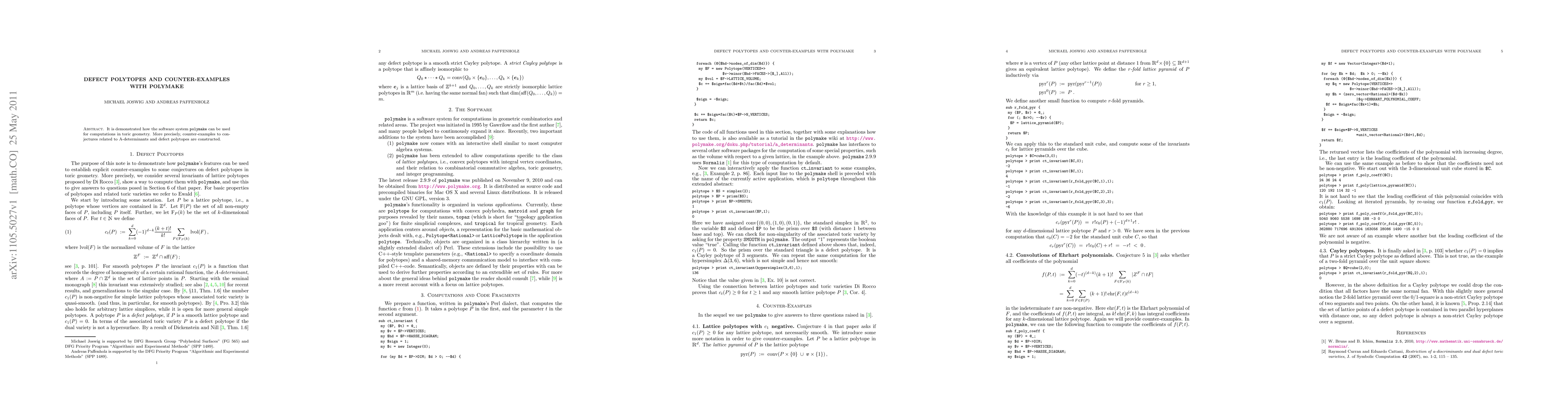 Summary: This paper showcases how the polymake software system is utilized for computations in toric geometry, specifically constructing counter-examples to conjectures concerning A-determinants and defect polytopes.