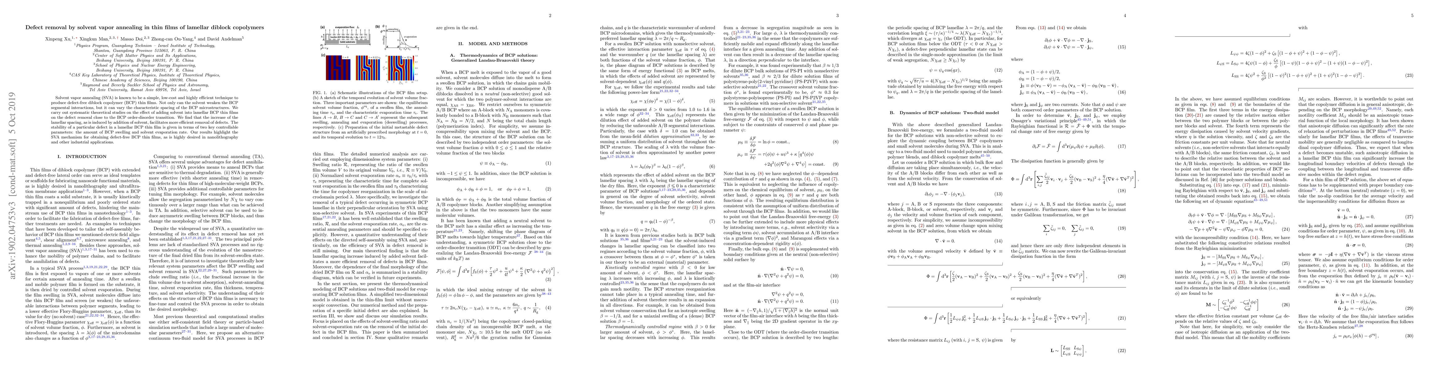 This paper investigates how solvent vapor annealing (SVA) enhances defect removal in thin films of lamellar diblock copolymers (BCP) near the order-disorder transition. The study finds that solvent-induced increases in lamellar spacing improve defect removal efficiency, highlighting SVA as a key technique for producing defect-free BCP films for nanolithography and industrial applications.
