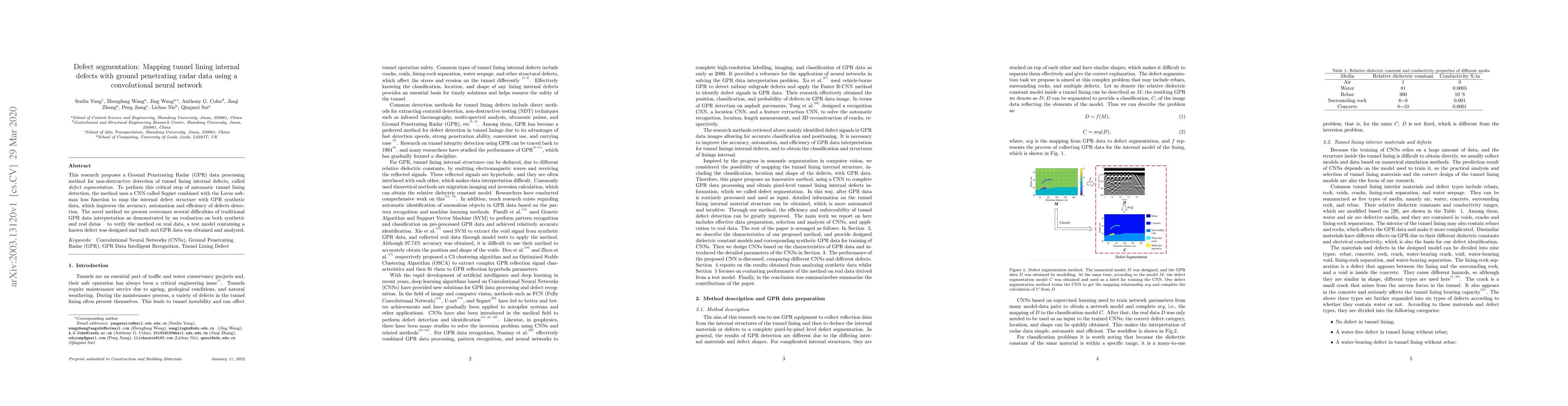This paper introduces a convolutional neural network (CNN) called Segnet with the Lovász softmax loss function to automatically detect tunnel lining internal defects using Ground Penetrating Radar (GPR) data, significantly improving detection accuracy and efficiency. The method was validated on both synthetic and real GPR data, demonstrating its effectiveness over traditional GPR data interpretation.