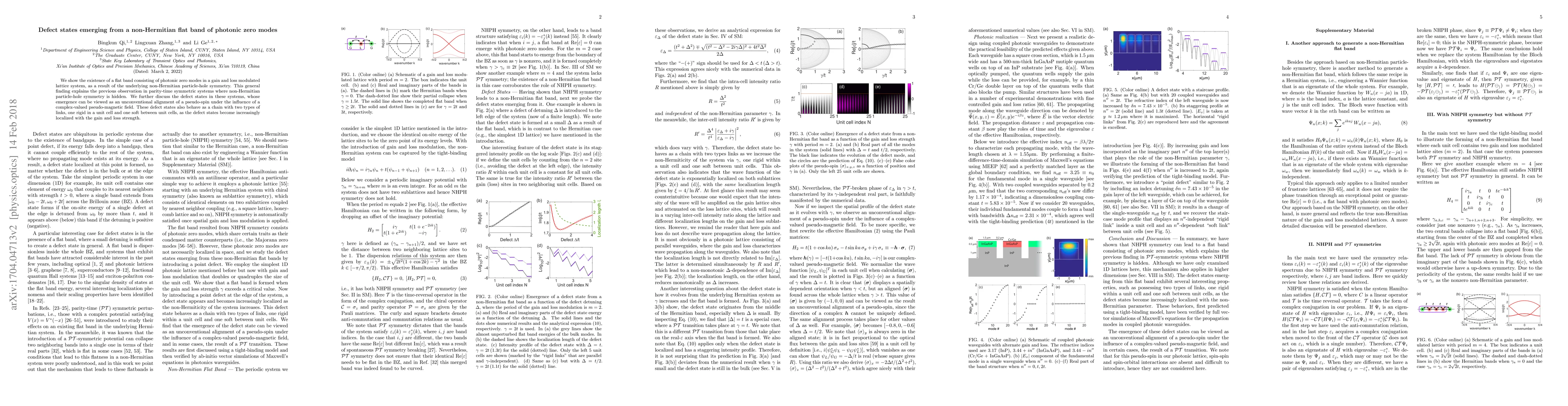 This paper demonstrates the emergence of a flat band of photonic zero modes in a gain and loss modulated lattice system due to non-Hermitian particle-hole symmetry. It explores the resulting defect states, which exhibit unique localization behavior influenced by a complex-valued pseudo-magnetic field, and proposes a practical photonic design using coupled InP/InGaAsP waveguides.