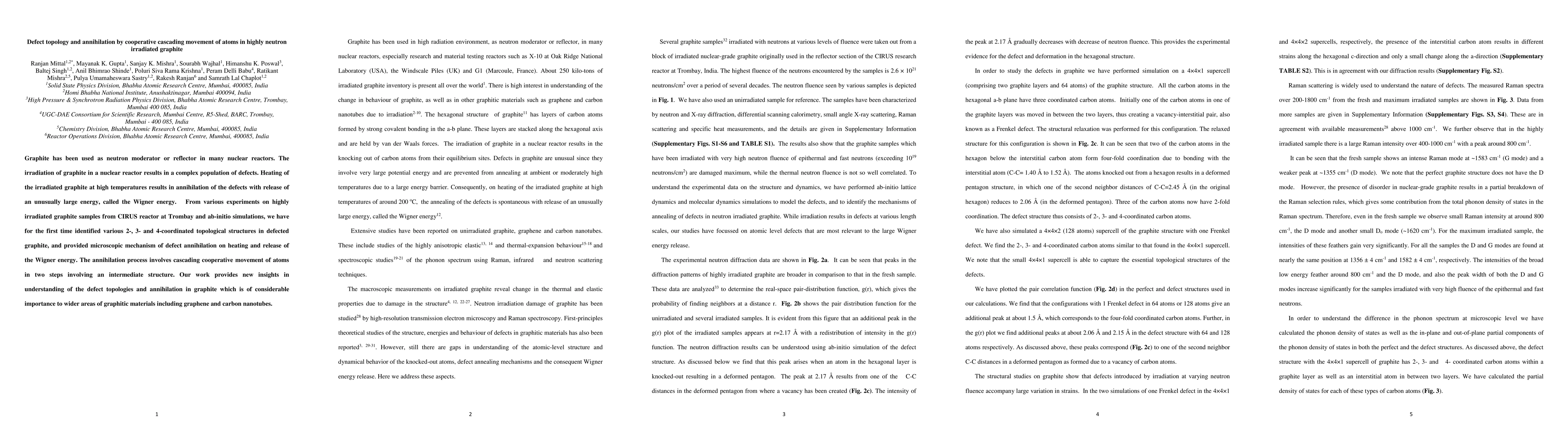 This study identifies complex defect topologies in neutron-irradiated graphite and elucidates the microscopic mechanism of defect annihilation upon heating, revealing a cascading cooperative atomic movement process. These findings enhance the understanding of defect behavior in graphite, with implications for graphitic materials like graphene and carbon nanotubes.