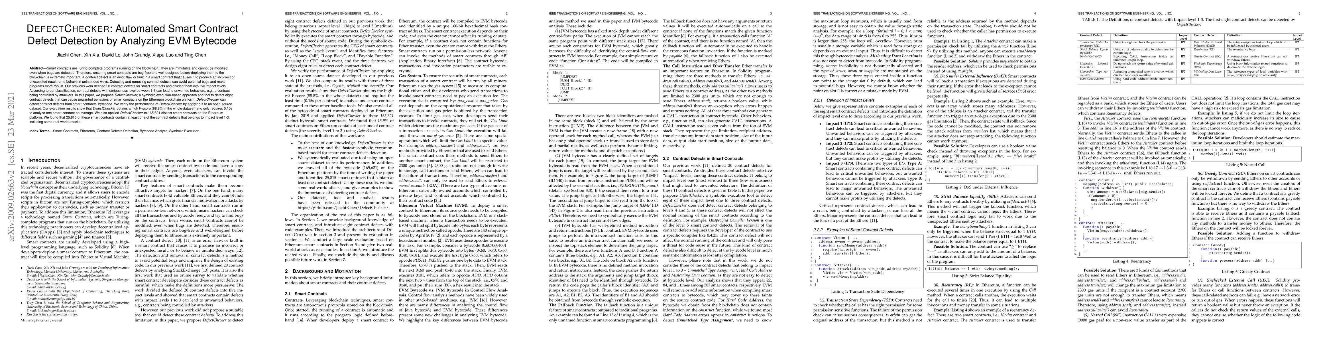 Title: DEFECTCHECKER: Automated Smart Contract Defect Detection by Analyzing EVM Bytecode Summary: This paper introduces DefectChecker, a symbolic execution tool for detecting eight critical defects in Ethereum smart contracts from their bytecode, outperforming existing tools like Oyente, Mythril, and Securify in speed and accuracy. The study found that 15.5% of analyzed contracts had at least one high-impact defect.