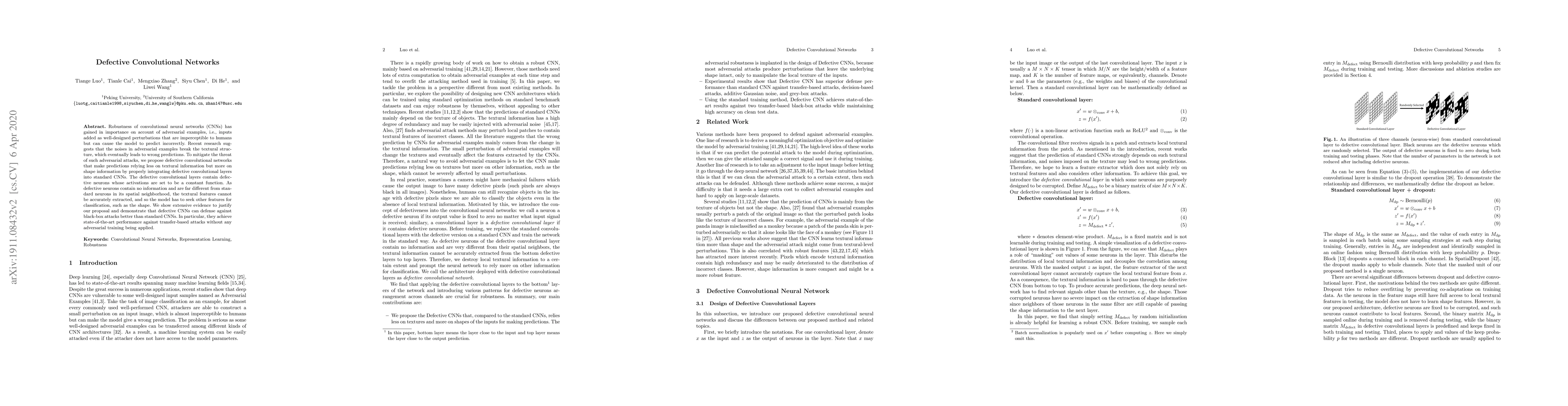 Robustness of convolutional neural networks (CNNs) has gained in importance on account of adversarial examples, i.e., inputs added as well-designed perturbations that are imperceptible to humans but can cause the model to predict incorrectly. Recent research suggests that the noises in adversarial examples break the textural structure, which eventually leads to wrong predictions. To mitigate the threat of such adversarial attacks, we propose defective convolutional networks that make predictions relying less on textural information but more on shape information by properly integrating defective convolutional layers into standard CNNs. The defective convolutional layers contain defective neurons whose activations are set to be a constant function. As defective neurons contain no information and are far different from standard neurons in its spatial neighborhood, the textural features cannot be accurately extracted, and so the model has to seek other features for classification, such as the shape. We show extensive evidence to justify our proposal and demonstrate that defective CNNs can defense against black-box attacks better than standard CNNs. In particular, they achieve state-of-the-art performance against transfer-based attacks without any adversarial training being applied.
