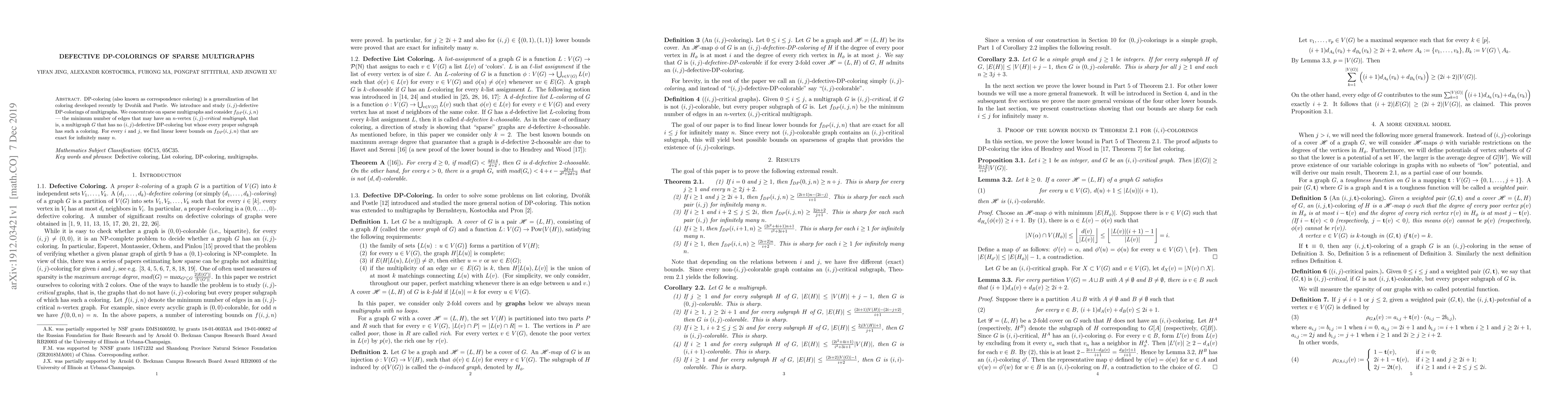 This paper introduces $(i,j)$-defective DP-colorings of sparse multigraphs, a generalization of list coloring, and studies $f_{DP}(i,j,n)$, the minimum edge count for an $n$-vertex $(i,j)$-critical multigraph. It establishes linear lower bounds for $f_{DP}(i,j,n)$ that hold exactly for infinitely many $n$.