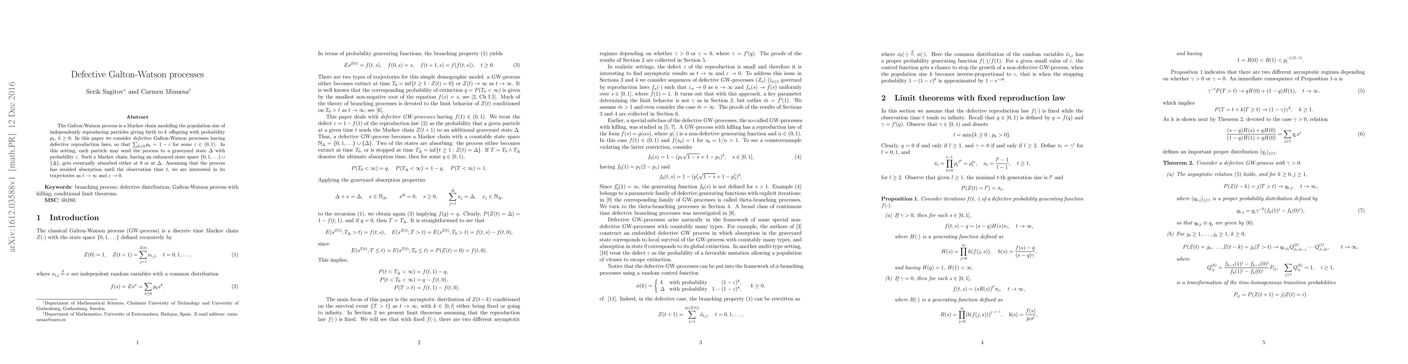 The paper analyzes defective Galton-Watson processes, which include an additional absorbing state and a defect probability ε, allowing the process to transition to this graveyard state Δ with probability ε.