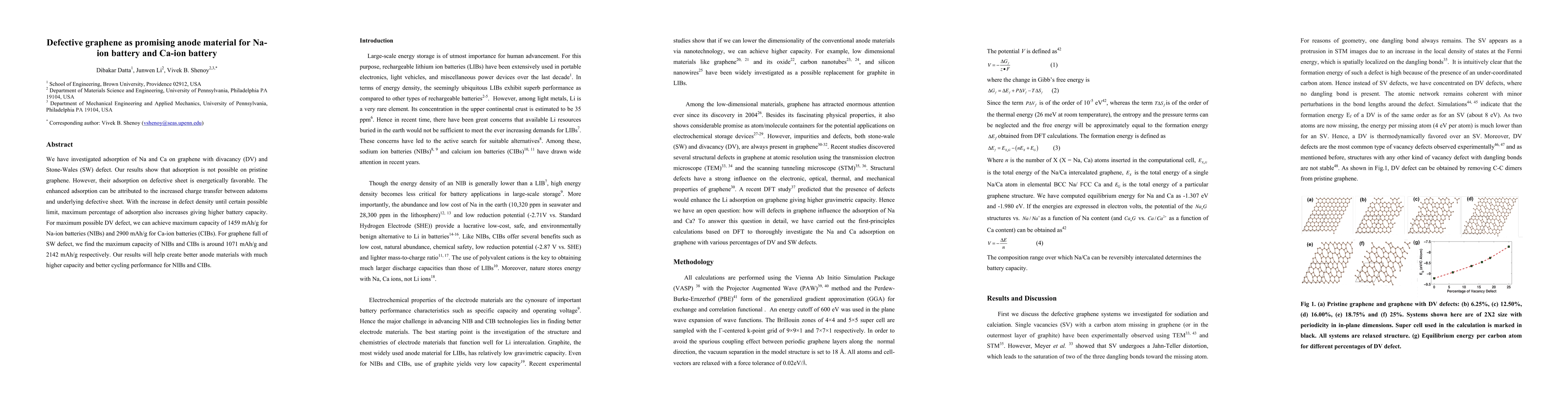 This study finds defective graphene, particularly with divacancy and Stone-Wales defects, to be a promising anode material for sodium-ion and calcium-ion batteries due to favorable adsorption and increased charge transfer. The maximum theoretical capacities achieved are 1459 mAh/g for Na-ion and 2900 mAh/g for Ca-ion batteries.