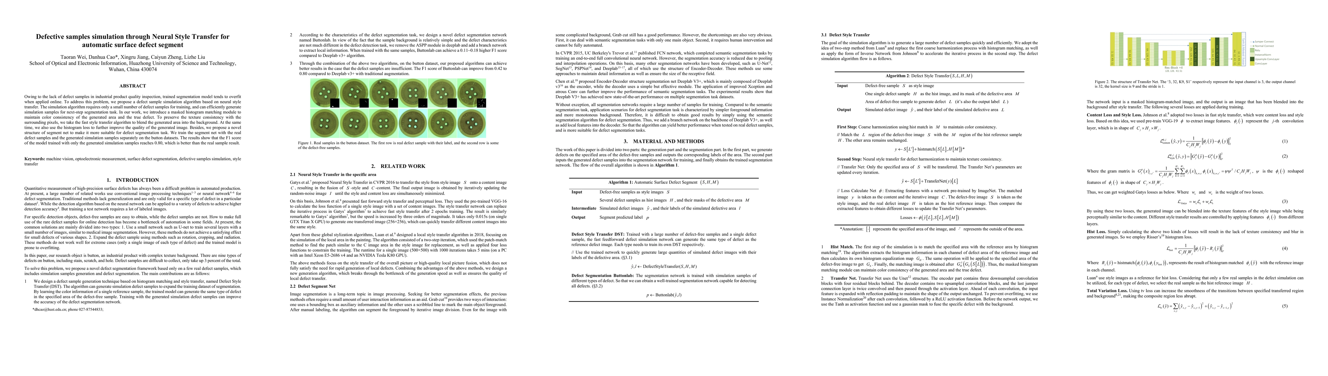 Owing to the lack of defect samples in industrial product quality inspection, trained segmentation model tends to overfit when applied online. To address this problem, we propose a defect sample simulation algorithm based on neural style transfer. The simulation algorithm requires only a small number of defect samples for training, and can efficiently generate simulation samples for next-step segmentation task. In our work, we introduce a masked histogram matching module to maintain color consistency of the generated area and the true defect. To preserve the texture consistency with the surrounding pixels, we take the fast style transfer algorithm to blend the generated area into the background. At the same time, we also use the histogram loss to further improve the quality of the generated image. Besides, we propose a novel structure of segment net to make it more suitable for defect segmentation task. We train the segment net with the real defect samples and the generated simulation samples separately on the button datasets. The results show that the F1 score of the model trained with only the generated simulation samples reaches 0.80, which is better than the real sample result.
