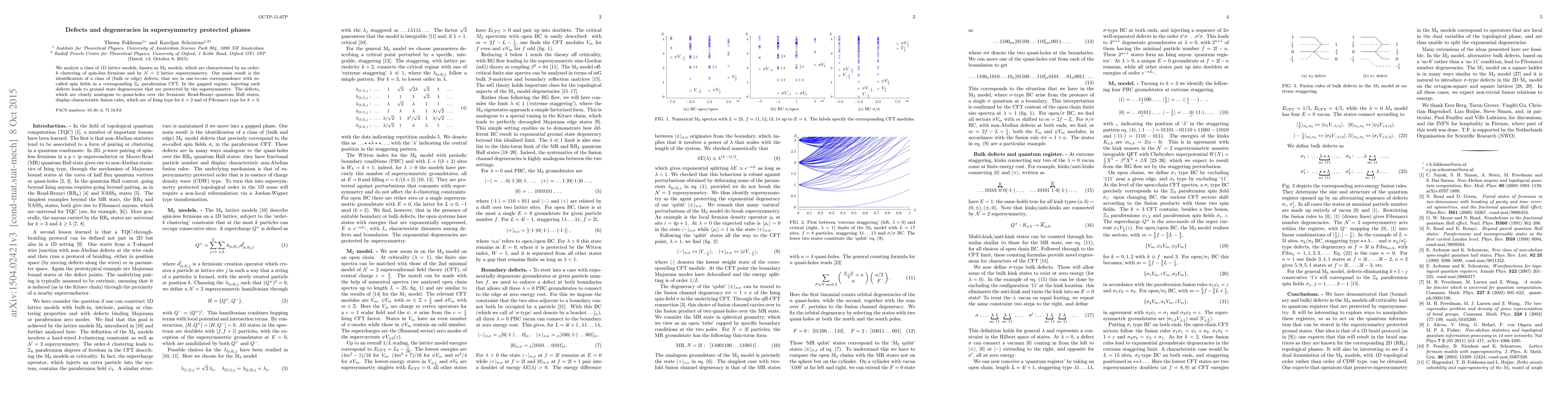 We analyse a class of 1D lattice models, known as M$_k$ models, which are characterised by an order-$k$ clustering of spin-less fermions and by ${\cal N}=2$ lattice supersymmetry. Our main result is the identification of a class of (bulk or edge) defects, that are in one-to-one correspondence with so-called spin fields in a corresponding $\mathbb{Z}_k$ parafermion CFT. In the gapped regime, injecting such defects leads to ground state degeneracies that are protected by the supersymmetry. The defects, which are closely analogous to quasi-holes over the fermionic Read-Rezayi quantum Hall states, display characteristic fusion rules, which are of Ising type for $k=2$ and of Fibonacci type for $k=3$.