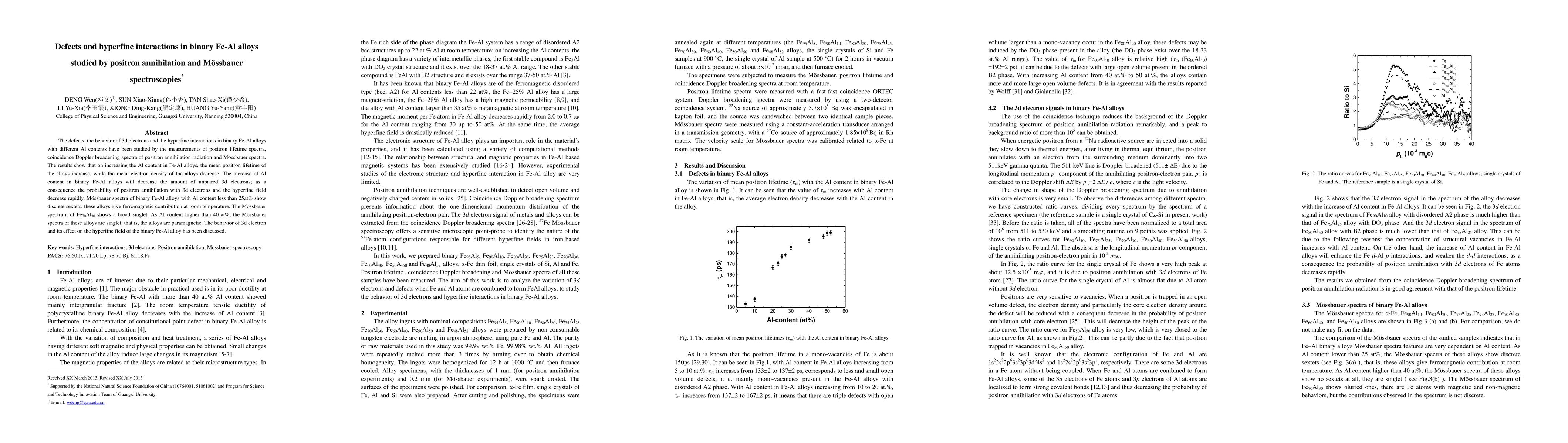 This study investigates defects and hyperfine interactions in Fe-Al alloys using positron annihilation and Mössbauer spectroscopies. Increasing Al content raises positron lifetime and decreases electron density, reducing unpaired 3d electrons and hyperfine field, while Mössbauer spectra reveal ferromagnetic behavior for low Al content and paramagnetic for higher Al content.
