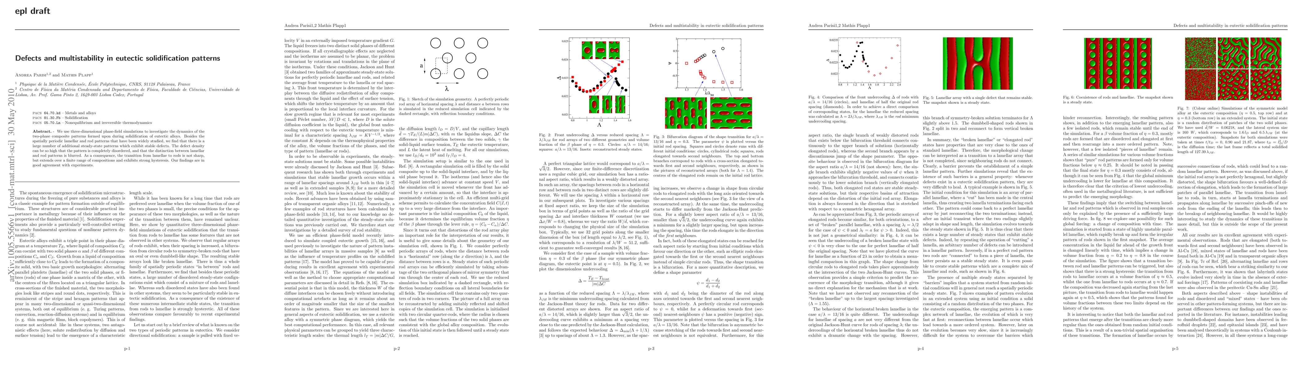 This paper explores the dynamics of eutectic alloy solidification using phase-field simulations, revealing a variety of steady-state patterns with stable defects, leading to multistability and a blurred transition between lamellar and rod patterns, with findings corroborated by experimental data.