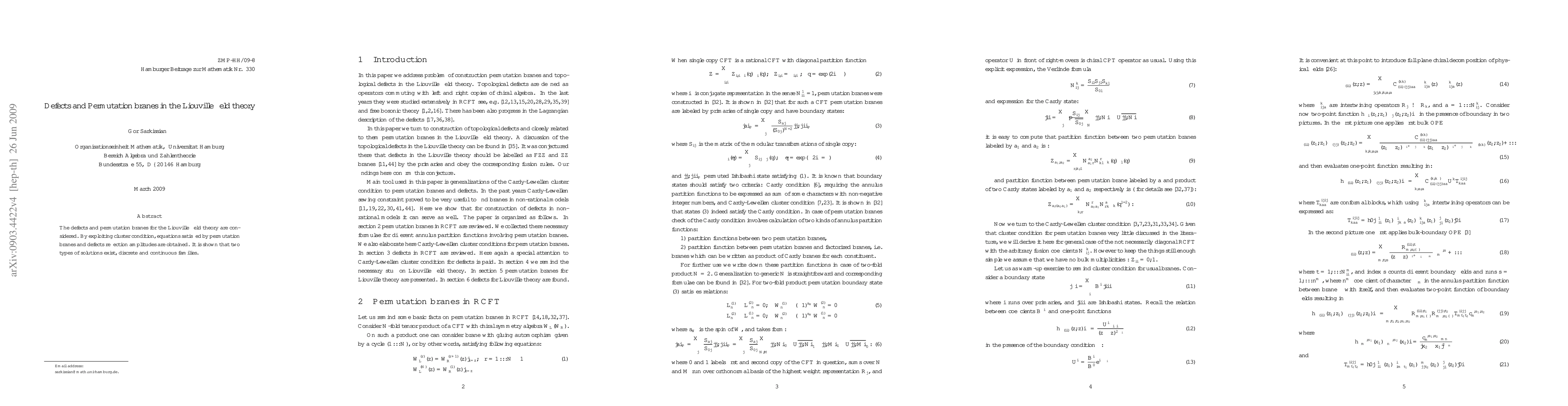 This paper investigates defects and permutation branes within Liouville field theory, deriving equations for permutation branes and defect reflection amplitudes using the cluster condition. It reveals two solution types: discrete and continuous families.