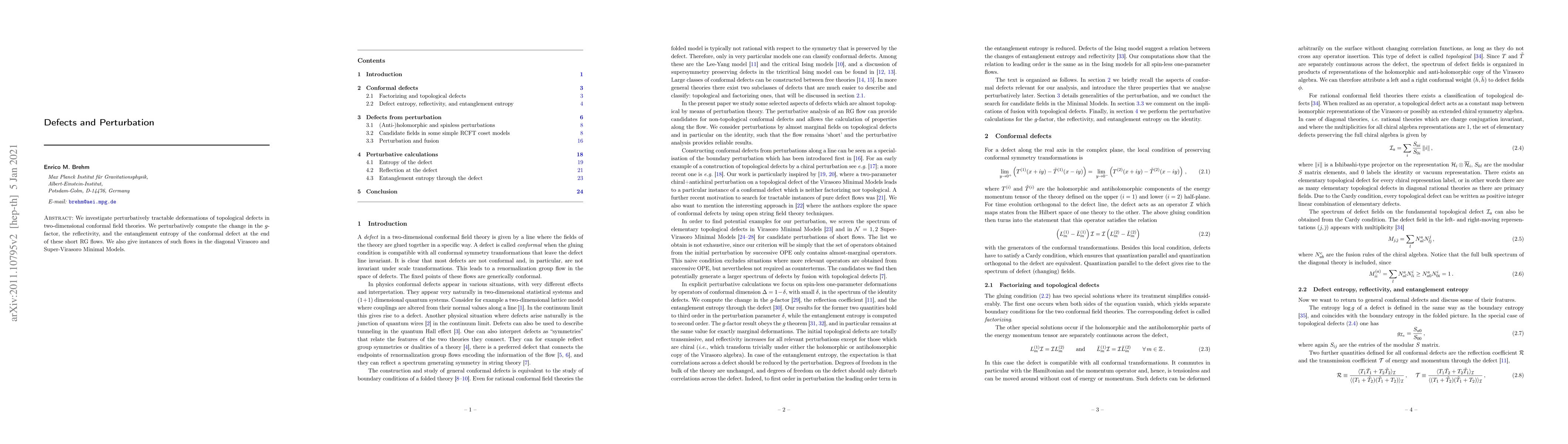 We investigate perturbatively tractable deformations of topological defects in two-dimensional conformal field theories. We perturbatively compute the change in the $g$-factor, the reflectivity, and the entanglement entropy of the conformal defect at the end of these short RG flows. We also give instances of such flows in the diagonal Virasoro and Super-Virasoro Minimal Models.
