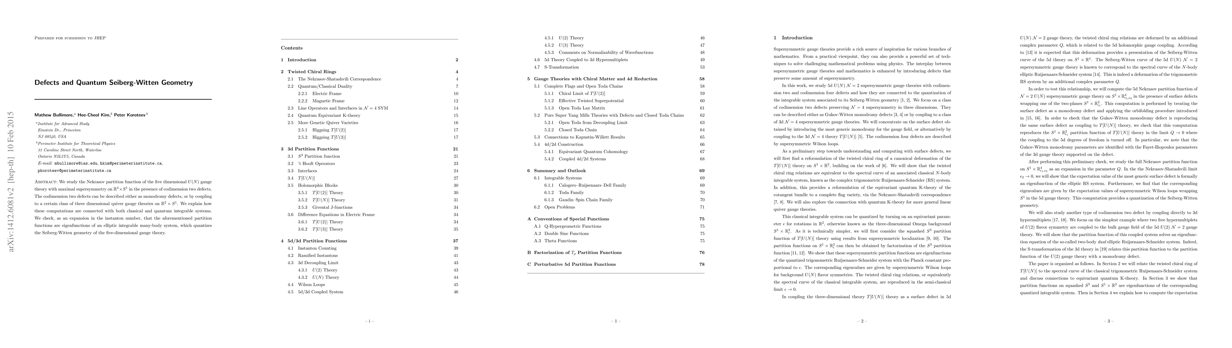 This paper investigates the Nekrasov partition function for a five-dimensional U(N) gauge theory with maximal supersymmetry, focusing on the effects of codimension two defects. It connects these computations to classical and quantum integrable systems, demonstrating that the partition functions are eigenfunctions of an elliptic integrable many-body system that quantizes the Seiberg-Witten geometry.