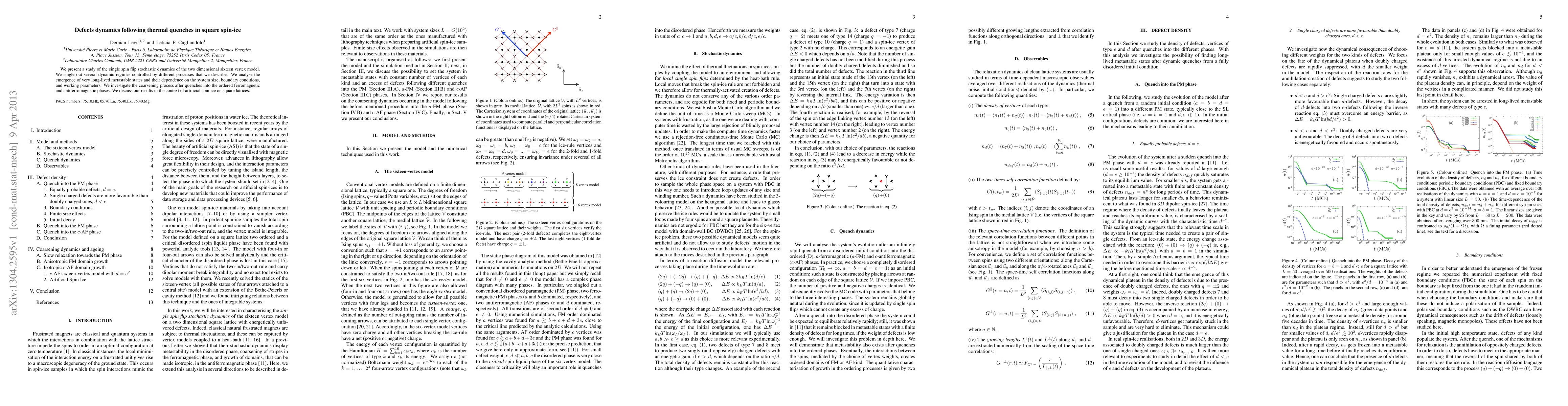 This study investigates the stochastic dynamics of the two-dimensional sixteen vertex model, focusing on defect behavior following thermal quenches. It identifies various dynamic regimes and analyzes the emergence of long-lived metastable states, their dependence on system size and conditions, and the coarsening process in ordered phases.