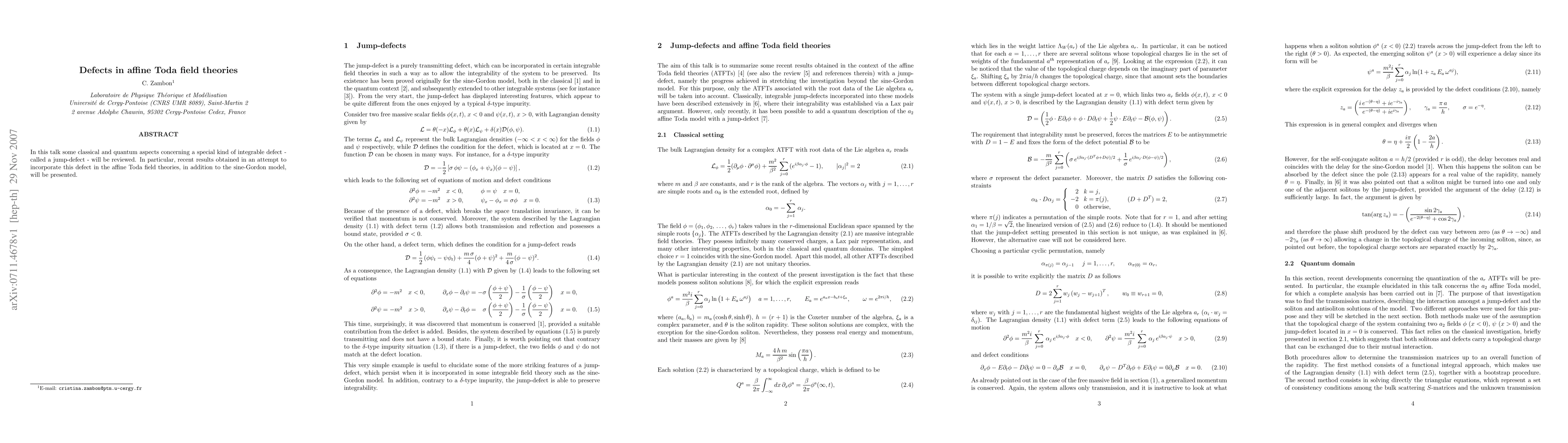 In this talk some classical and quantum aspects concerning a special kind of integrable defect - called a jump-defect - will be reviewed. In particular, recent results obtained in an attempt to incorporate this defect in the affine Toda field theories, in addition to the sine-Gordon model, will be presented.