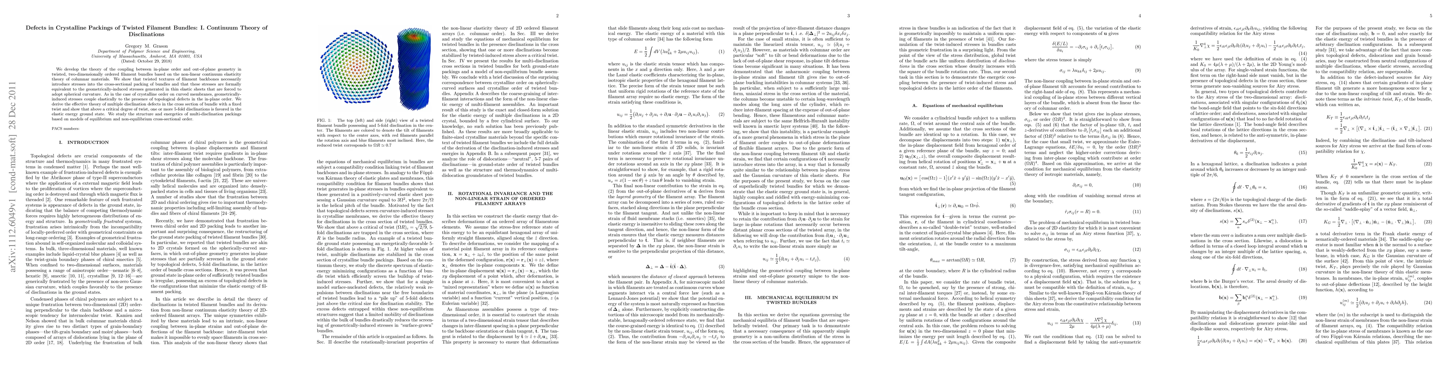 This paper develops a continuum theory for the coupling between in-plane order and out-of-plane geometry in twisted filament bundles, showing that twist-induced stresses are equivalent to those in curved elastic sheets. It derives an effective theory for multiple disclination defects, revealing that above a critical twist degree, 5-fold disclinations are energetically favored in the bundle's ground state.