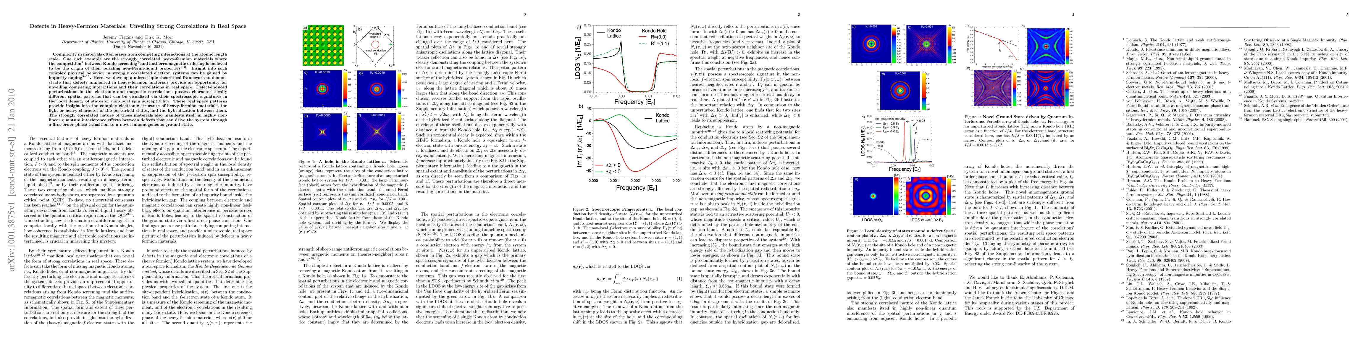 This paper develops a theoretical framework to explore how defects in heavy-fermion materials reveal competing interactions and correlations in real space, providing insights into their complex electronic structure and non-Fermi-liquid behavior through spectroscopic signatures. The study also highlights non-linear quantum interference effects and first-order phase transitions driven by defects.