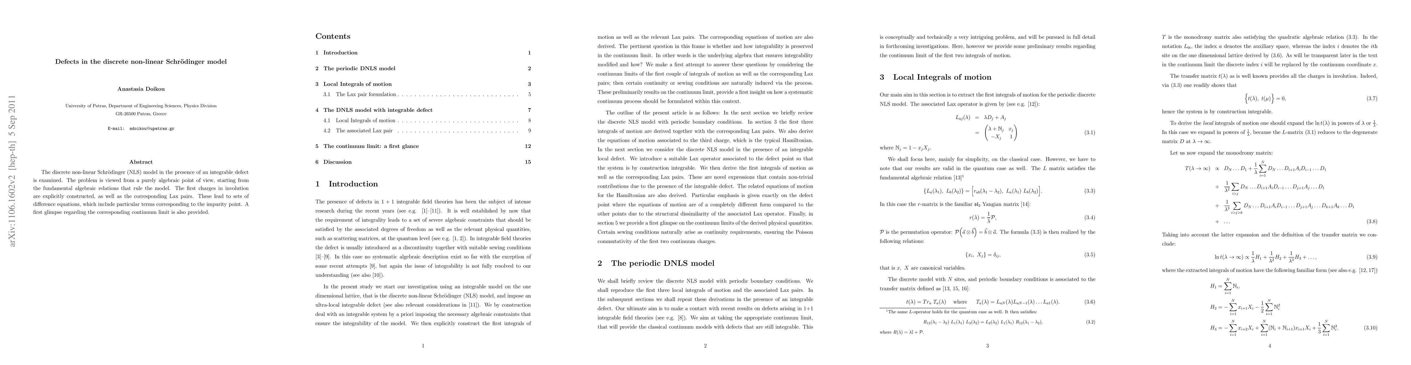 Researchers studied defects in a discrete non-linear Schrodinger model using algebraic methods to understand the behavior of impurities and their impact on the system's dynamics. The study aimed to provide insights into the continuum limit of the model by analyzing difference equations and Lax pairs.