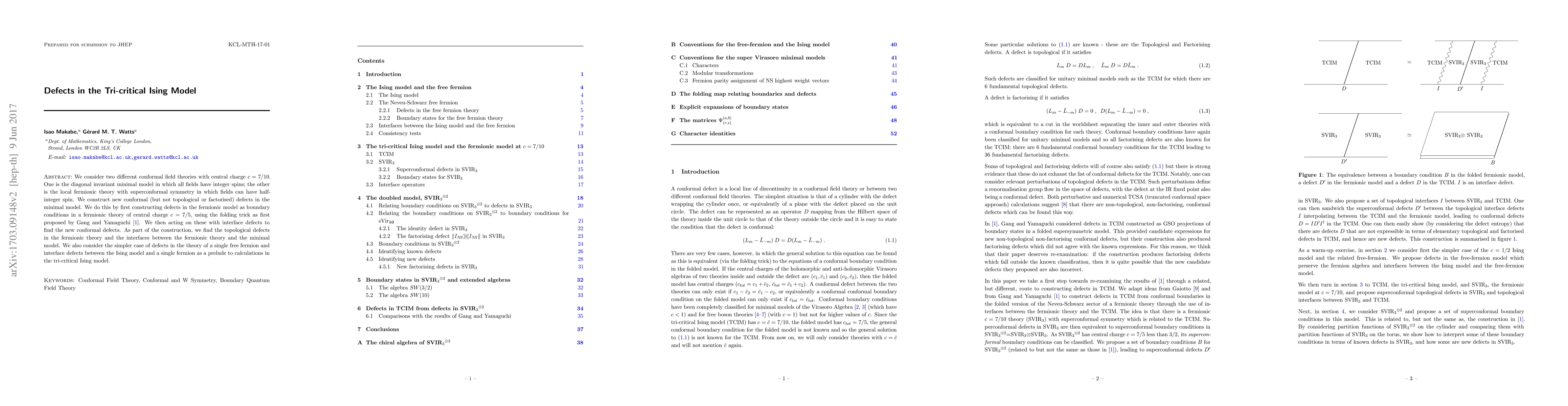 We consider two different conformal field theories with central charge c=7/10. One is the diagonal invariant minimal model in which all fields have integer spins; the other is the local fermionic theory with superconformal symmetry in which fields can have half-integer spin. We construct new conformal (but not topological or factorised) defects in the minimal model. We do this by first constructing defects in the fermionic model as boundary conditions in a fermionic theory of central charge c=7/5, using the folding trick as first proposed by Gang and Yamaguchi. We then acting on these with interface defects to find the new conformal defects. As part of the construction, we find the topological defects in the fermionic theory and the interfaces between the fermionic theory and the minimal model. We also consider the simpler case of defects in the theory of a single free fermion and interface defects between the Ising model and a single fermion as a prelude to calculations in the tri-critical Ising model.