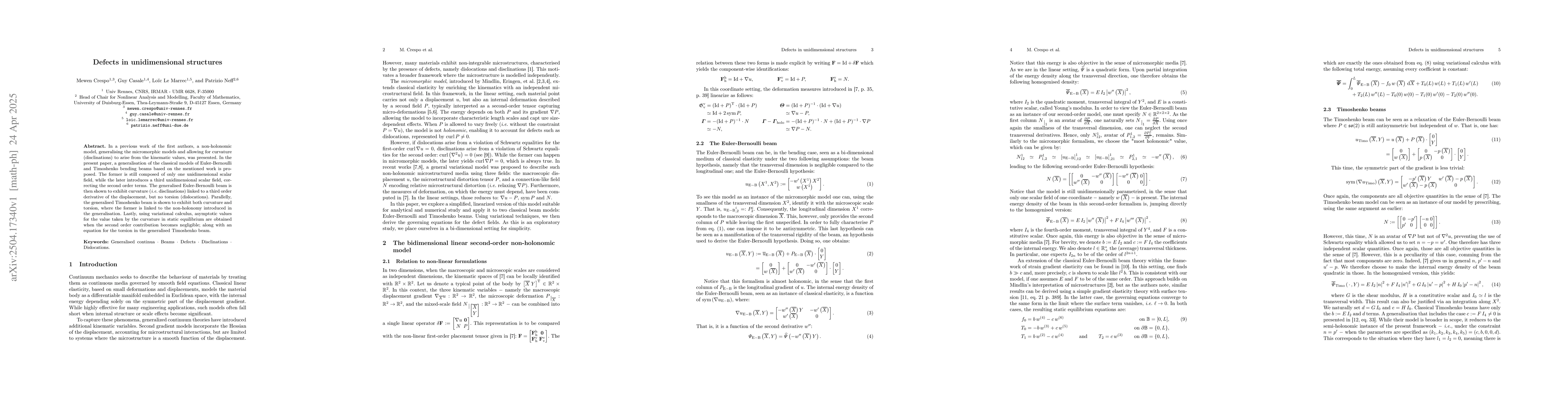 The work extends micromorphic models by allowing for curvature from kinematic values, providing a unique perspective on defects in unidimensional structures not previously explored in classical beam theories.