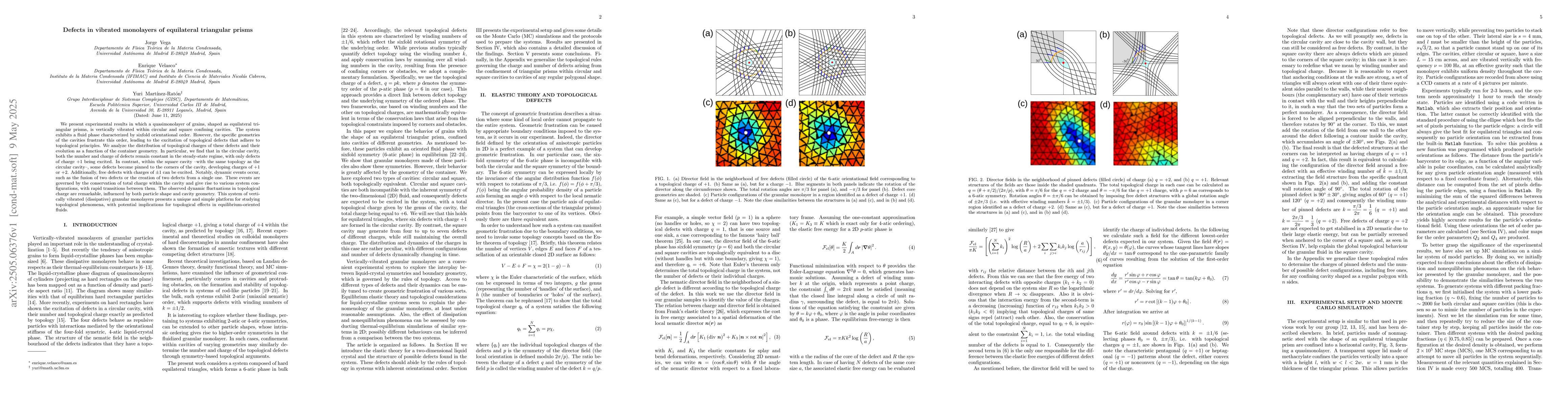 The paper demonstrates the excitation and behavior of topological defects in vertically vibrated granular monolayers confined in circular and square cavities, highlighting their dynamic fluctuations governed by charge conservation.