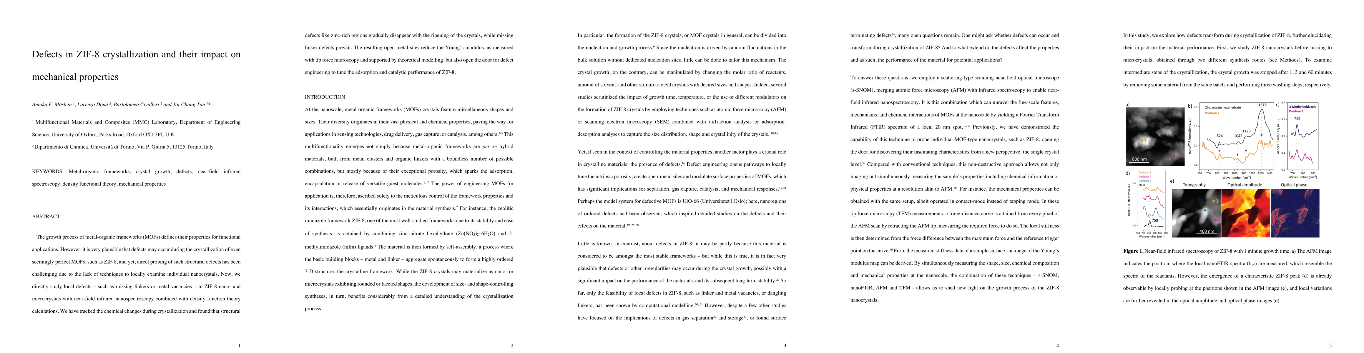 This study investigates the defects in ZIF-8 crystallization using near-field infrared nanospectroscopy and density function theory, revealing that missing linker defects persist while zinc-rich regions diminish over time. These defects lower the Young's modulus but offer potential for engineering ZIF-8's adsorption and catalytic properties.