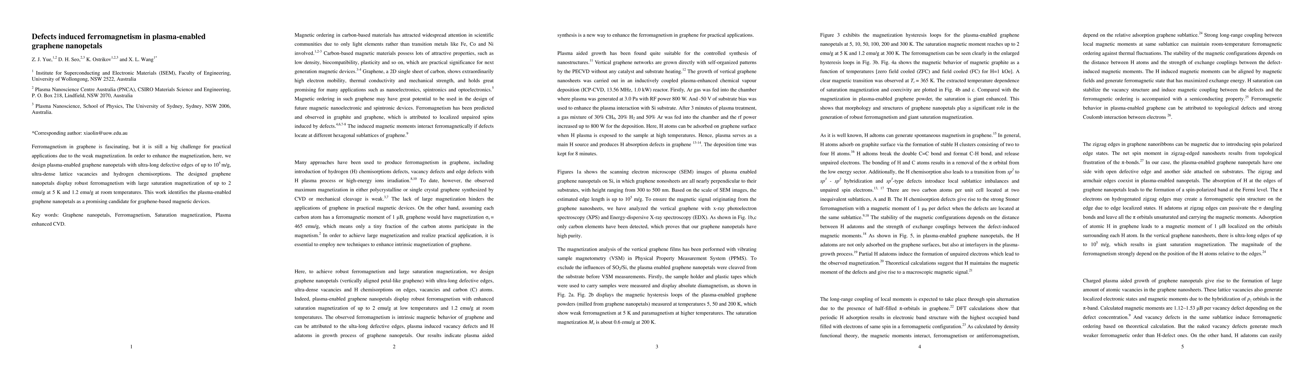 The paper presents a novel approach to enhancing ferromagnetism in graphene through the design of plasma-enabled graphene nanopetals with tailored defects and hydrogen chemisorptions.