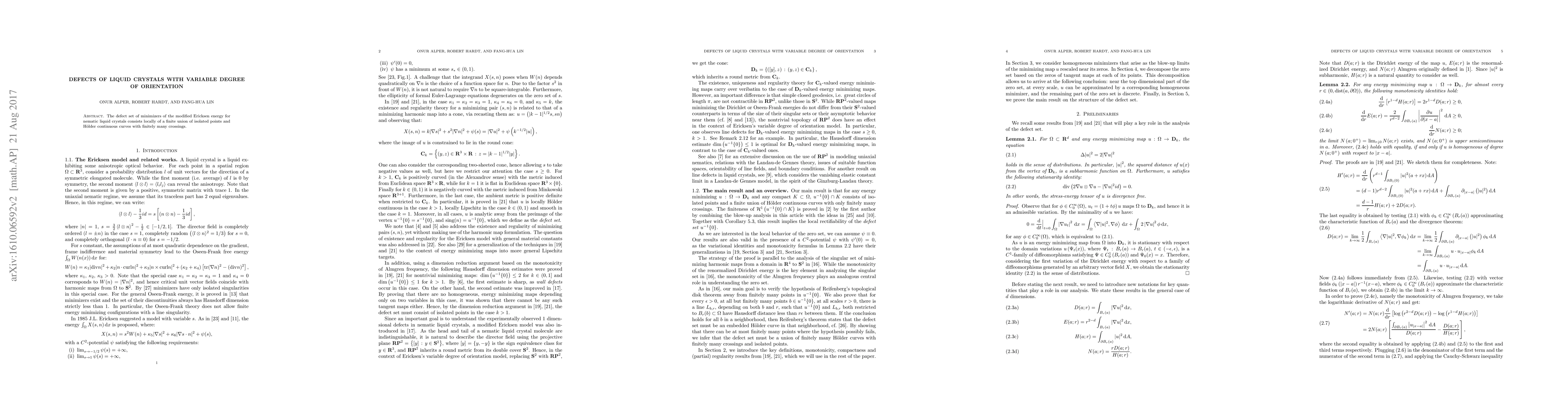 We prove that the zero set of a minimizer of the modified Ericksen energy for nematic liquid crystals with variable degree of orientation consists locally of isolated points and a finite union of H\"older continuous curves with only finitely many crossings.