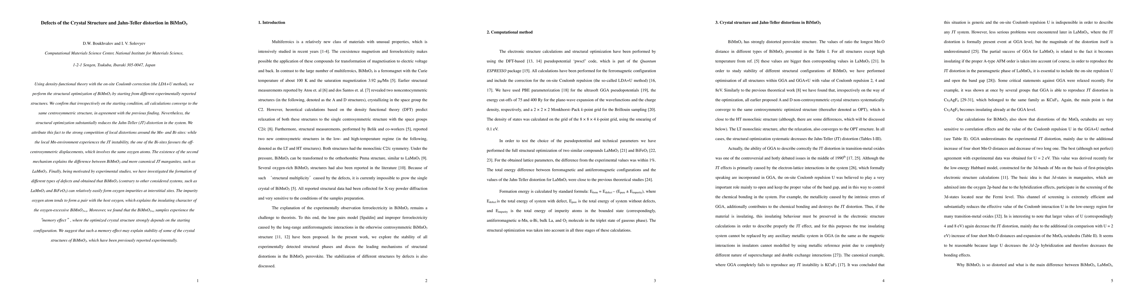 Using density-functional theory with the on-site Coulomb correction (the LDA+U method), we perform the structural optimization of BiMnO3 by starting from different experimentally reported structures. We confirm that irrespectively on the starting condition, all calculations converge to the same centrosymmetric structure, in agreement with the previous finding. Nevertheless, the structural optimization substantially reduces the Jahn-Teller (JT) distortion in the system. We attribute this fact to the strong competition of local distortions around the Mn- and Bi-sites: while the local Mn-environment experiences the JT instability, the one of the Bi-sites favours the off-centrosymmetric displacements, which involves the same oxygen atoms. The existence of the second mechanism explains the difference between BiMnO3 and more canonical JT manganites, such as LaMnO3. Finally, being motivated by experimental studies, we have investigated the formation of different types of defects and obtained that BiMnO3 (contrary to other considered systems, such as LaMnO3 and BiFeO3) can relatively easily form oxygen impurities at interstitial sites. The impurity oxygen atom tends to form a pair with the host oxygen, which explains the insulating character of the oxygen-excessive BiMnO3+x. Moreover, we found that the BiMnO3+x samples experience the "memory effect", where the optimized crystal structure strongly depends on the starting configuration. We suggest that such a memory effect may explain stability of some of the crystal structures of BiMnO3, which have been previously reported experimentally.