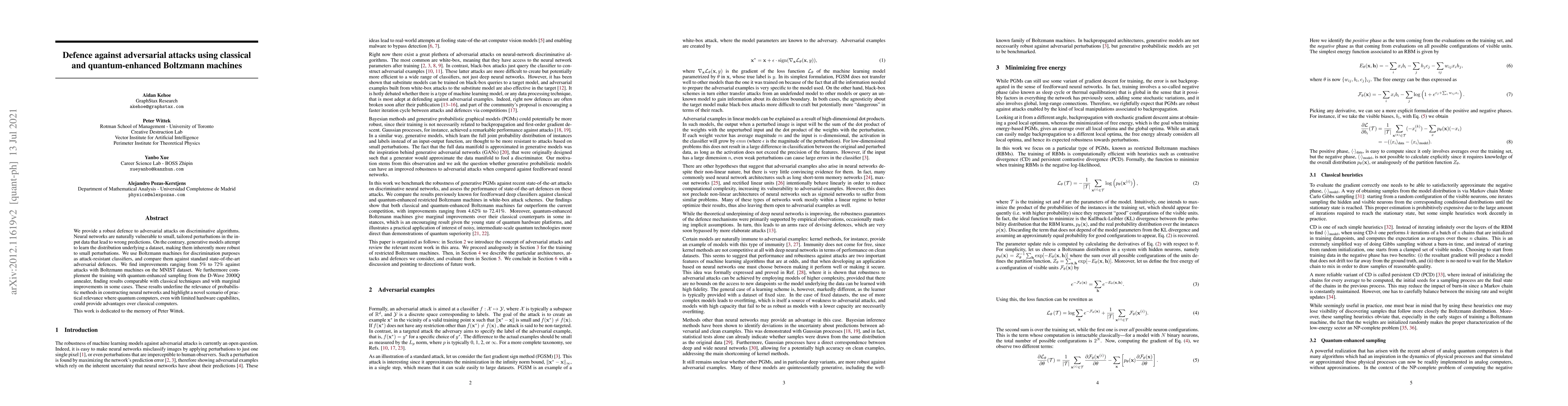 We provide a robust defence to adversarial attacks on discriminative algorithms. Neural networks are naturally vulnerable to small, tailored perturbations in the input data that lead to wrong predictions. On the contrary, generative models attempt to learn the distribution underlying a dataset, making them inherently more robust to small perturbations. We use Boltzmann machines for discrimination purposes as attack-resistant classifiers, and compare them against standard state-of-the-art adversarial defences. We find improvements ranging from 5% to 72% against attacks with Boltzmann machines on the MNIST dataset. We furthermore complement the training with quantum-enhanced sampling from the D-Wave 2000Q annealer, finding results comparable with classical techniques and with marginal improvements in some cases. These results underline the relevance of probabilistic methods in constructing neural networks and highlight a novel scenario of practical relevance where quantum computers, even with limited hardware capabilites, could provide advantages over classical computers. This work is dedicated to the memory of Peter Wittek.