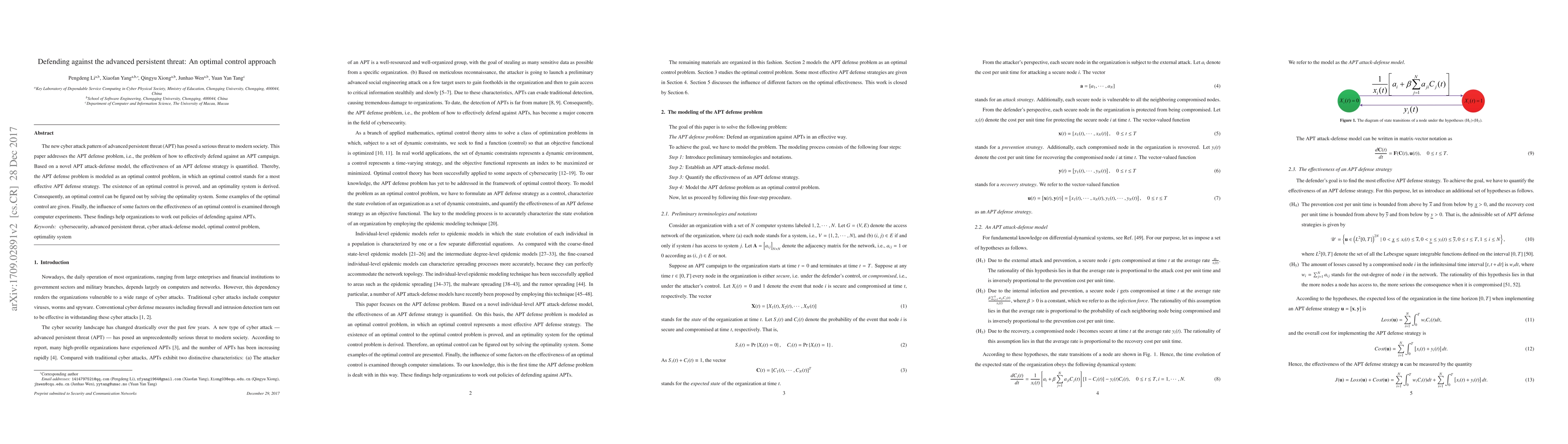 This paper models the defense against advanced persistent threats (APTs) as an optimal control problem, deriving an optimality system to determine the most effective defense strategy. It proves the existence of an optimal control and provides examples, while also examining factors influencing its effectiveness through computer experiments.