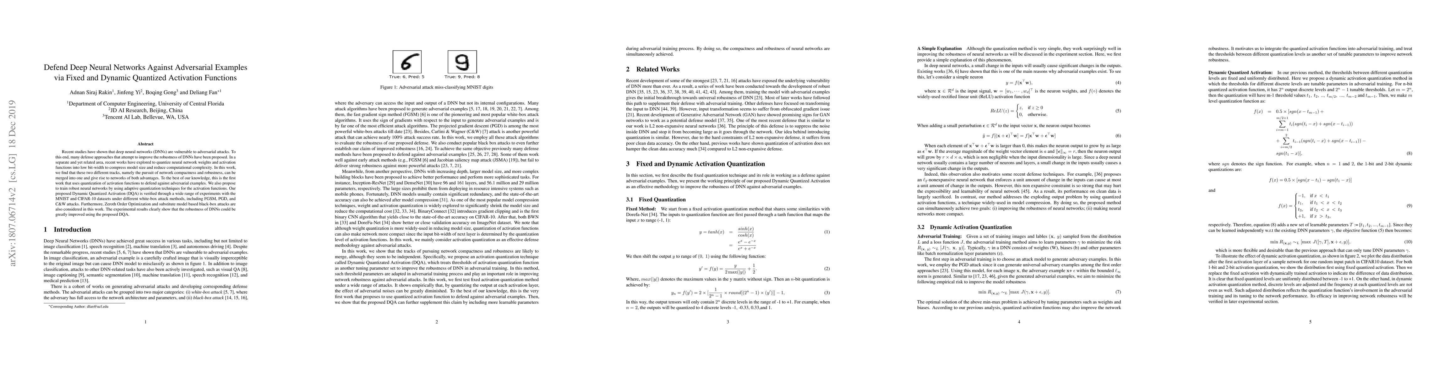 This paper proposes a novel defense mechanism against adversarial attacks in deep neural networks by utilizing quantized activation functions, both fixed and adaptive. The Dynamic Quantized Activation (DQA) method significantly enhances the robustness of DNNs against various white-box and black-box attack methods, as demonstrated through extensive experiments on MNIST and CIFAR-10 datasets.