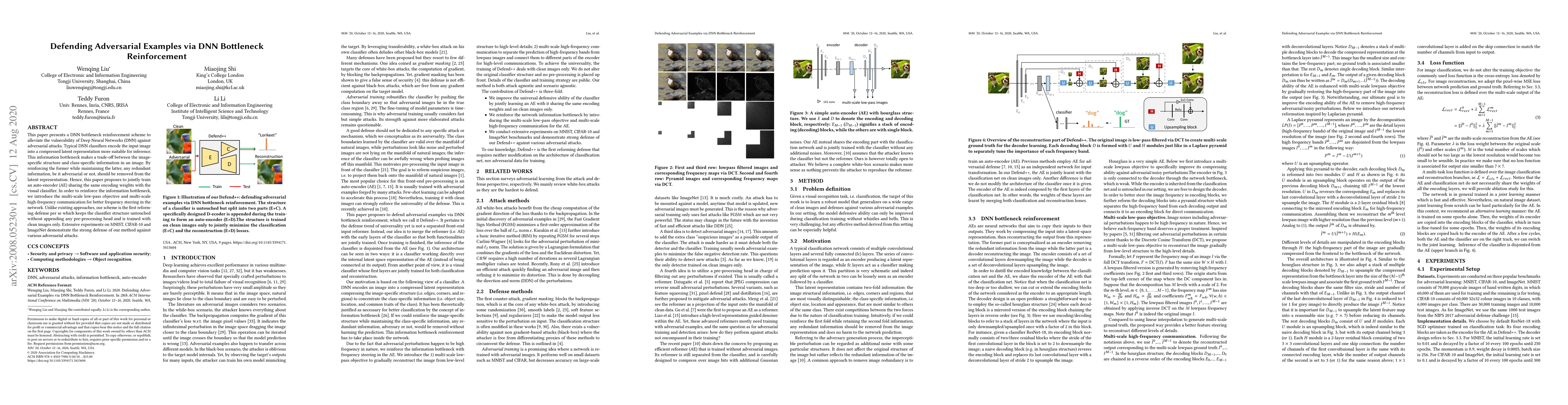 This paper proposes a DNN bottleneck reinforcement scheme to defend against adversarial attacks by jointly training an auto-encoder with the visual classifier, using multi-scale objectives to remove redundant information. Unlike other methods, this approach modifies the information bottleneck without altering the classifier structure and is trained solely with clean images.