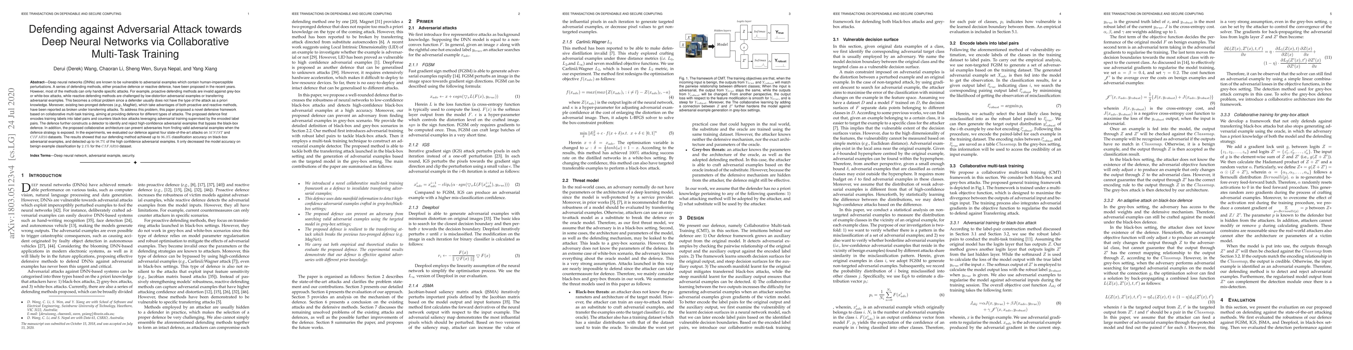 This paper proposes a collaborative multi-task training framework to defend deep neural networks against various adversarial attacks. The method utilizes encoded label pairs for black-box attack defence and a detector for high-confidence adversarial examples, achieving 96.3% accuracy against black-box attacks and 98.7% detection rate for high-confidence adversarial examples with minimal benign example classification loss.