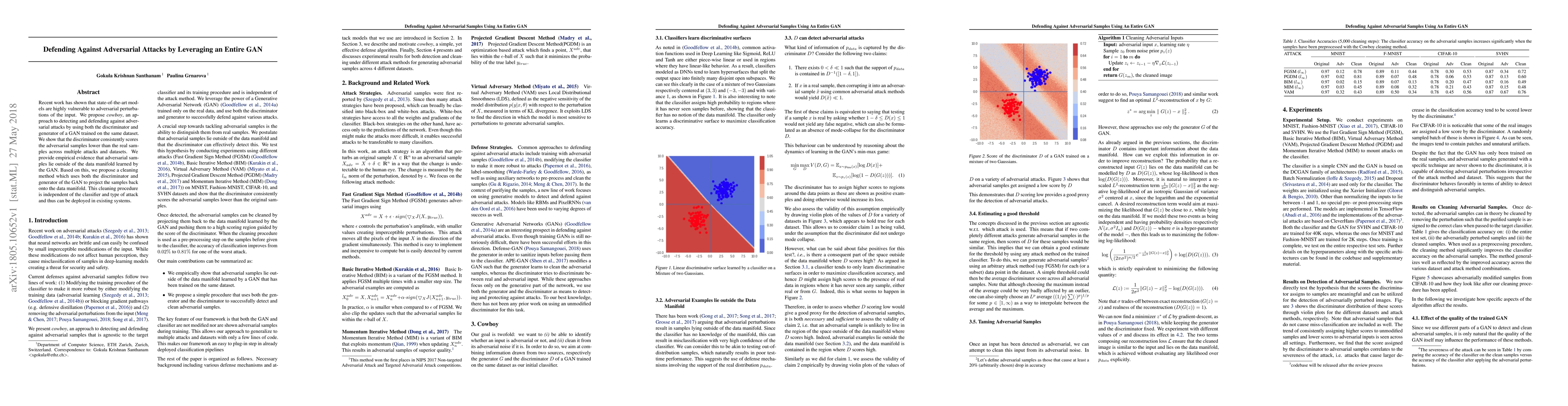 This paper proposes "cowboy," an approach to detect and defend against adversarial attacks by utilizing both the discriminator and generator of a GAN trained on the same dataset. The discriminator effectively scores adversarial samples lower than real samples, indicating they lie outside the data manifold learned by the GAN, leading to a cleaning method that projects adversarial samples back onto the data manifold for improved defense.