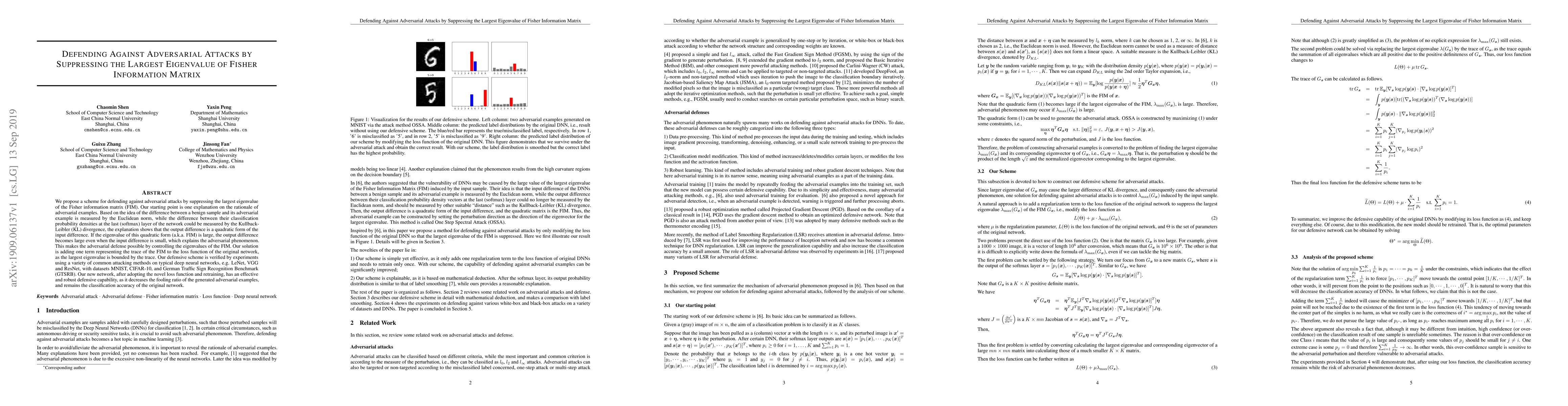 We propose a scheme for defending against adversarial attacks by suppressing the largest eigenvalue of the Fisher information matrix (FIM). Our starting point is one explanation on the rationale of adversarial examples. Based on the idea of the difference between a benign sample and its adversarial example is measured by the Euclidean norm, while the difference between their classification probability densities at the last (softmax) layer of the network could be measured by the Kullback-Leibler (KL) divergence, the explanation shows that the output difference is a quadratic form of the input difference. If the eigenvalue of this quadratic form (a.k.a. FIM) is large, the output difference becomes large even when the input difference is small, which explains the adversarial phenomenon. This makes the adversarial defense possible by controlling the eigenvalues of the FIM. Our solution is adding one term representing the trace of the FIM to the loss function of the original network, as the largest eigenvalue is bounded by the trace. Our defensive scheme is verified by experiments using a variety of common attacking methods on typical deep neural networks, e.g. LeNet, VGG and ResNet, with datasets MNIST, CIFAR-10, and German Traffic Sign Recognition Benchmark (GTSRB). Our new network, after adopting the novel loss function and retraining, has an effective and robust defensive capability, as it decreases the fooling ratio of the generated adversarial examples, and remains the classification accuracy of the original network.