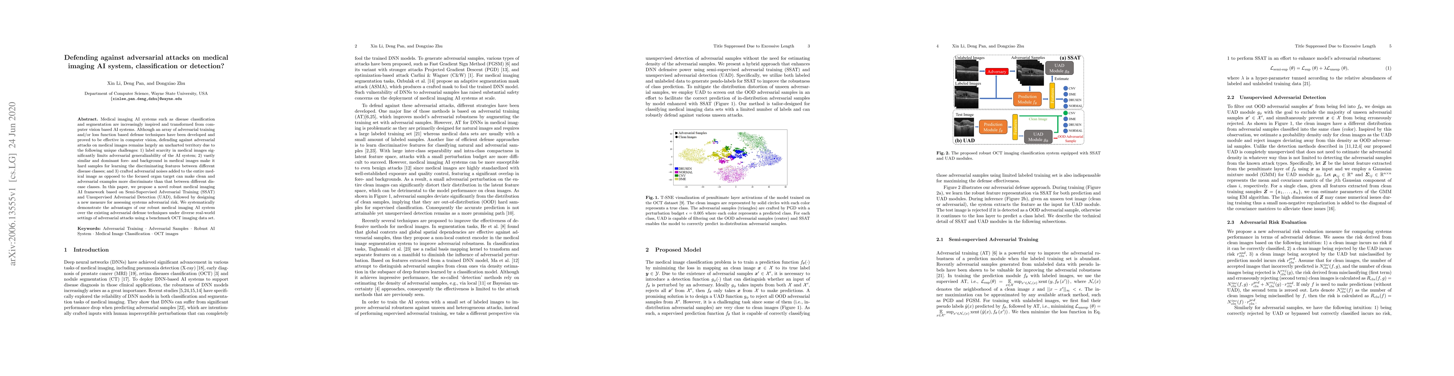 Medical imaging AI systems such as disease classification and segmentation are increasingly inspired and transformed from computer vision based AI systems. Although an array of adversarial training and/or loss function based defense techniques have been developed and proved to be effective in computer vision, defending against adversarial attacks on medical images remains largely an uncharted territory due to the following unique challenges: 1) label scarcity in medical images significantly limits adversarial generalizability of the AI system; 2) vastly similar and dominant fore- and background in medical images make it hard samples for learning the discriminating features between different disease classes; and 3) crafted adversarial noises added to the entire medical image as opposed to the focused organ target can make clean and adversarial examples more discriminate than that between different disease classes. In this paper, we propose a novel robust medical imaging AI framework based on Semi-Supervised Adversarial Training (SSAT) and Unsupervised Adversarial Detection (UAD), followed by designing a new measure for assessing systems adversarial risk. We systematically demonstrate the advantages of our robust medical imaging AI system over the existing adversarial defense techniques under diverse real-world settings of adversarial attacks using a benchmark OCT imaging data set.