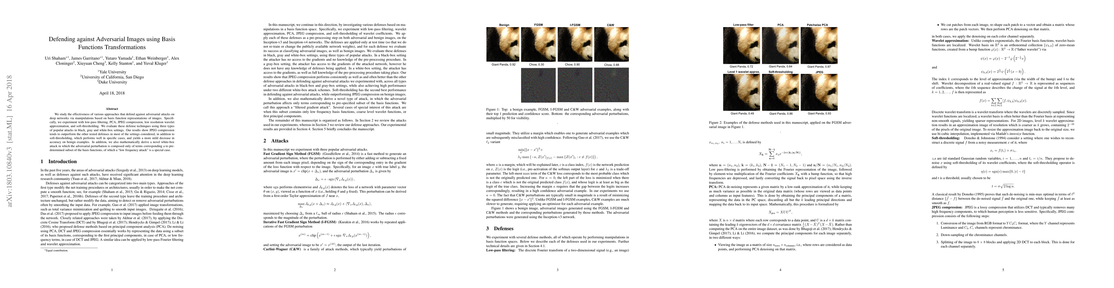 We study the effectiveness of various approaches that defend against adversarial attacks on deep networks via manipulations based on basis function representations of images. Specifically, we experiment with low-pass filtering, PCA, JPEG compression, low resolution wavelet approximation, and soft-thresholding. We evaluate these defense techniques using three types of popular attacks in black, gray and white-box settings. Our results show JPEG compression tends to outperform the other tested defenses in most of the settings considered, in addition to soft-thresholding, which performs well in specific cases, and yields a more mild decrease in accuracy on benign examples. In addition, we also mathematically derive a novel white-box attack in which the adversarial perturbation is composed only of terms corresponding a to pre-determined subset of the basis functions, of which a "low frequency attack" is a special case.