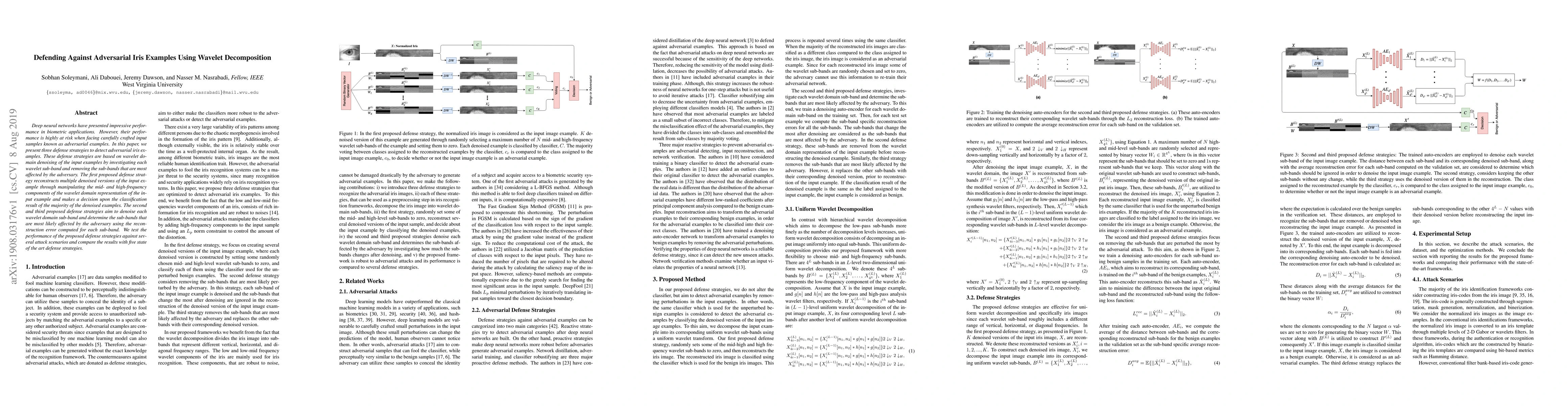 This paper proposes three wavelet decomposition-based defense strategies to identify and mitigate adversarial examples in iris recognition systems. The methods involve denoising specific wavelet sub-bands and assessing reconstruction errors to detect adversarial manipulations, ultimately enhancing the robustness of deep neural networks in biometric applications.