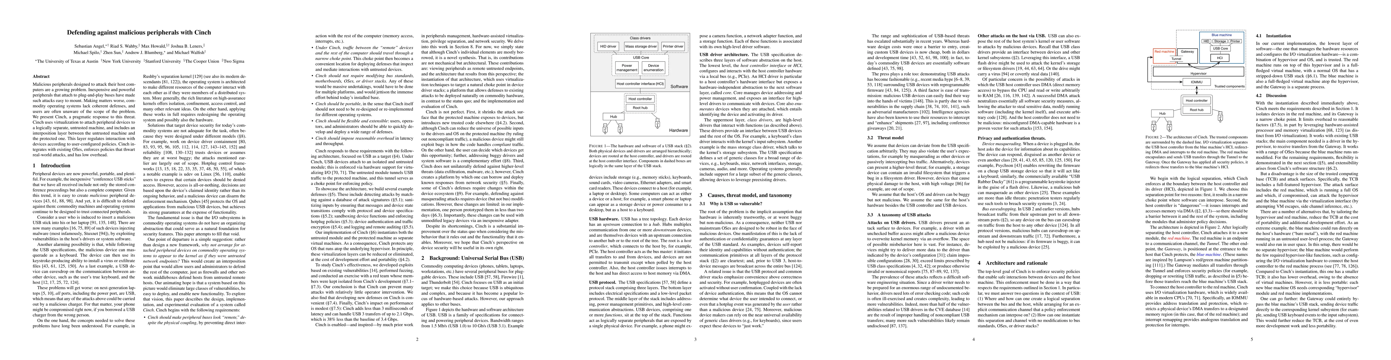Malicious peripherals designed to attack their host computers are a growing problem. Inexpensive and powerful peripherals that attach to plug-and-play buses have made such attacks easy to mount. Making matters worse, commodity operating systems lack coherent defenses, and users are often unaware of the scope of the problem. We present Cinch, a pragmatic response to this threat. Cinch uses virtualization to attach peripheral devices to a logically separate, untrusted machine, and includes an interposition layer between the untrusted machine and the protected one. This layer regulates interaction with devices according to user-configured policies. Cinch integrates with existing OSes, enforces policies that thwart real-world attacks, and has low overhead.