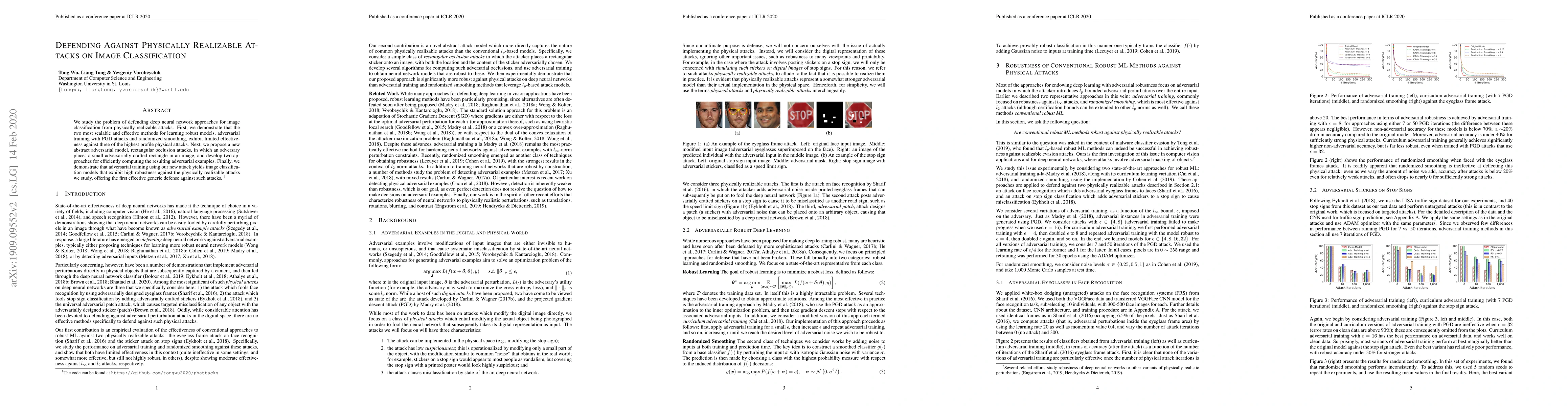 We study the problem of defending deep neural network approaches for image classification from physically realizable attacks. First, we demonstrate that the two most scalable and effective methods for learning robust models, adversarial training with PGD attacks and randomized smoothing, exhibit very limited effectiveness against three of the highest profile physical attacks. Next, we propose a new abstract adversarial model, rectangular occlusion attacks, in which an adversary places a small adversarially crafted rectangle in an image, and develop two approaches for efficiently computing the resulting adversarial examples. Finally, we demonstrate that adversarial training using our new attack yields image classification models that exhibit high robustness against the physically realizable attacks we study, offering the first effective generic defense against such attacks.